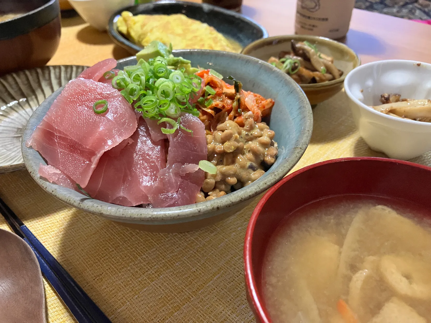 ポキ丼作ろうと思ったけどよく分からなかったのでキムチ、納豆、アボカド、マグロで丼にしました