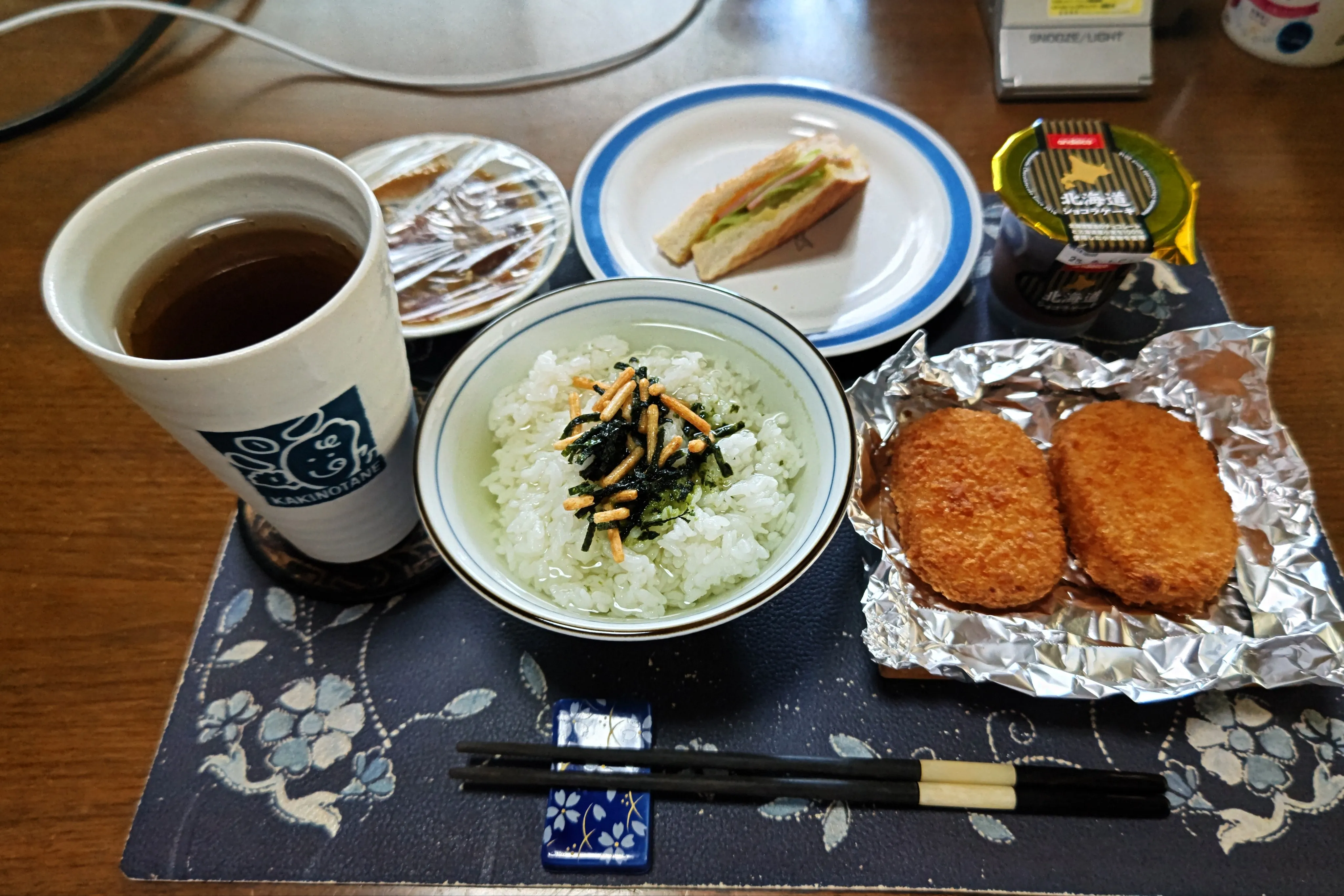・お茶漬け:温かいご飯、永谷園のお茶づけ海苔、熱湯
