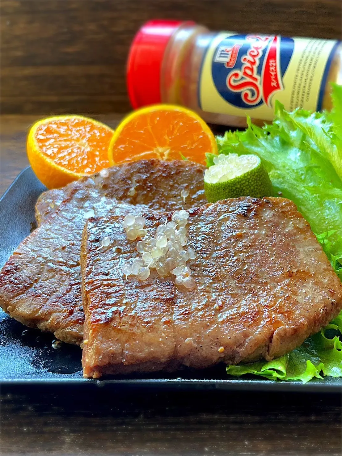 スパイス21をふりふりして焼いたお肉をフィンガーライムでいただきました😋