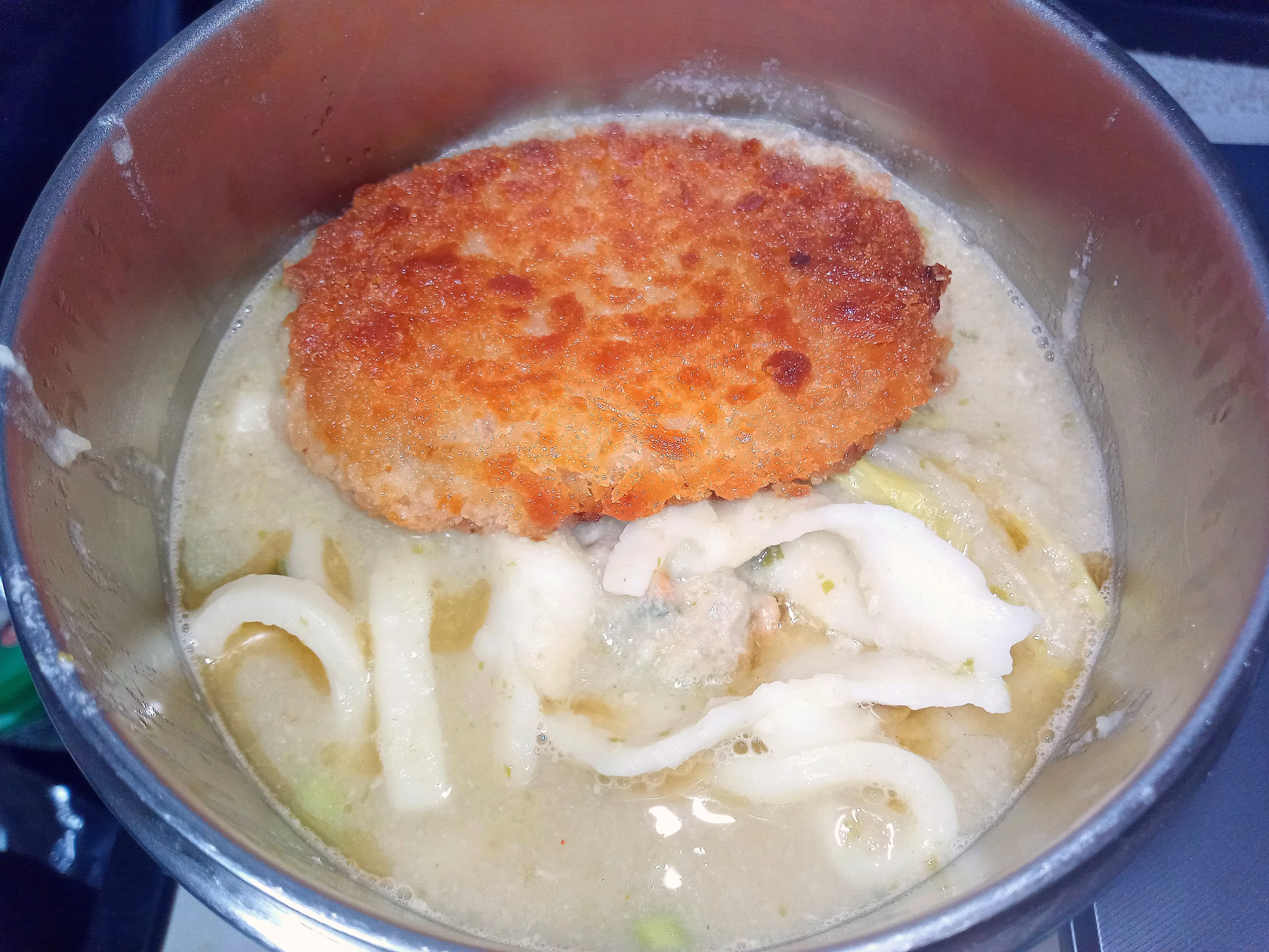 おはようございます。今朝は家族から餃子鍋をたくさん分けてもらったのでま舞茸を足して粉砕し、うどんと煮てコロッケを乗せました。結構美味いです。