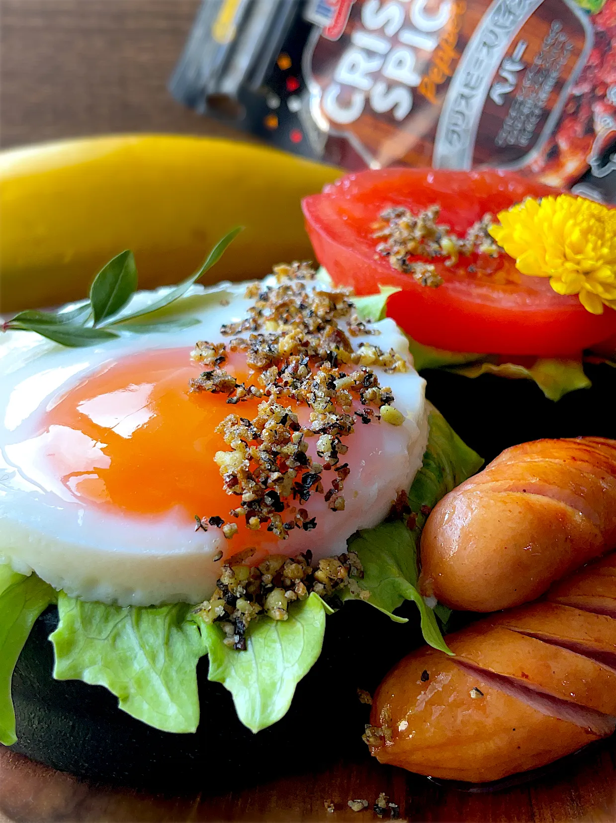#snapdish #ユウキ食品 #クリスピースパイスペパー #竹炭ラウンドパン #竹炭パン #目玉焼き #ウインナー #おいしい世界ごはんパートナー #目玉焼き