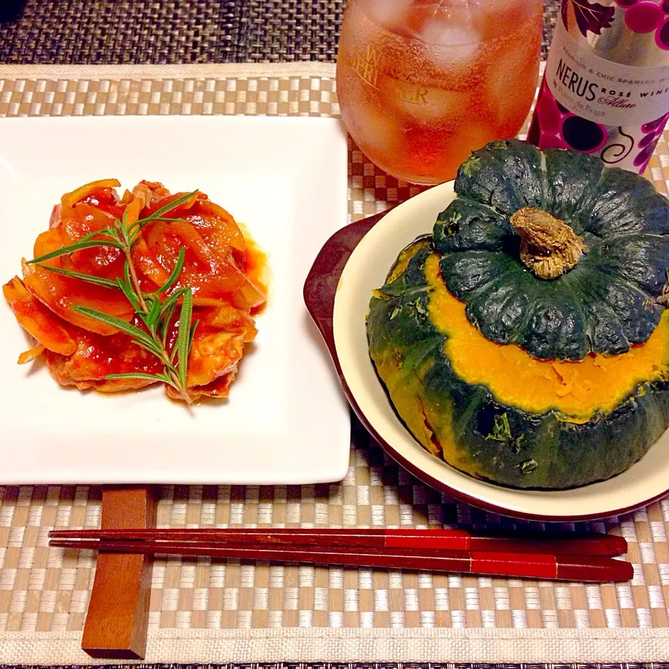 今日は冷蔵庫掃除!坊ちゃんカボチャ丸ごとチン!チキンのトマトジュース煮!ロゼスパークリングで乾杯 #showchu #家居酒屋 #宅呑 #手抜料理