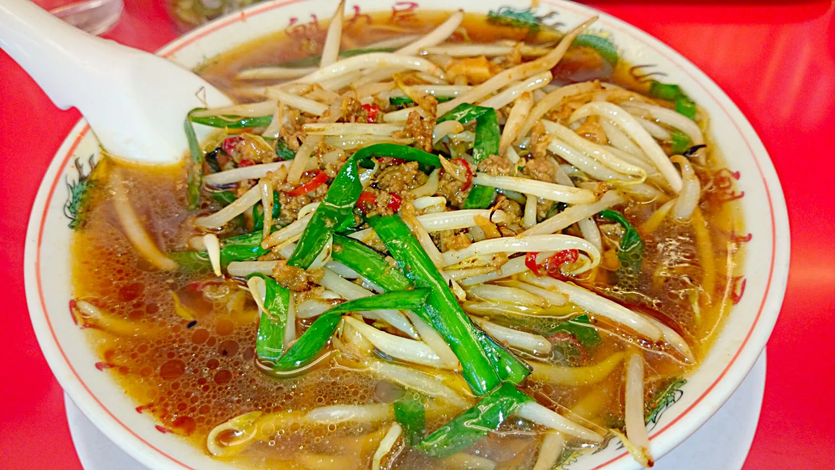 ニンニク、ニラ、モヤシ入りの辛口ラーメン。