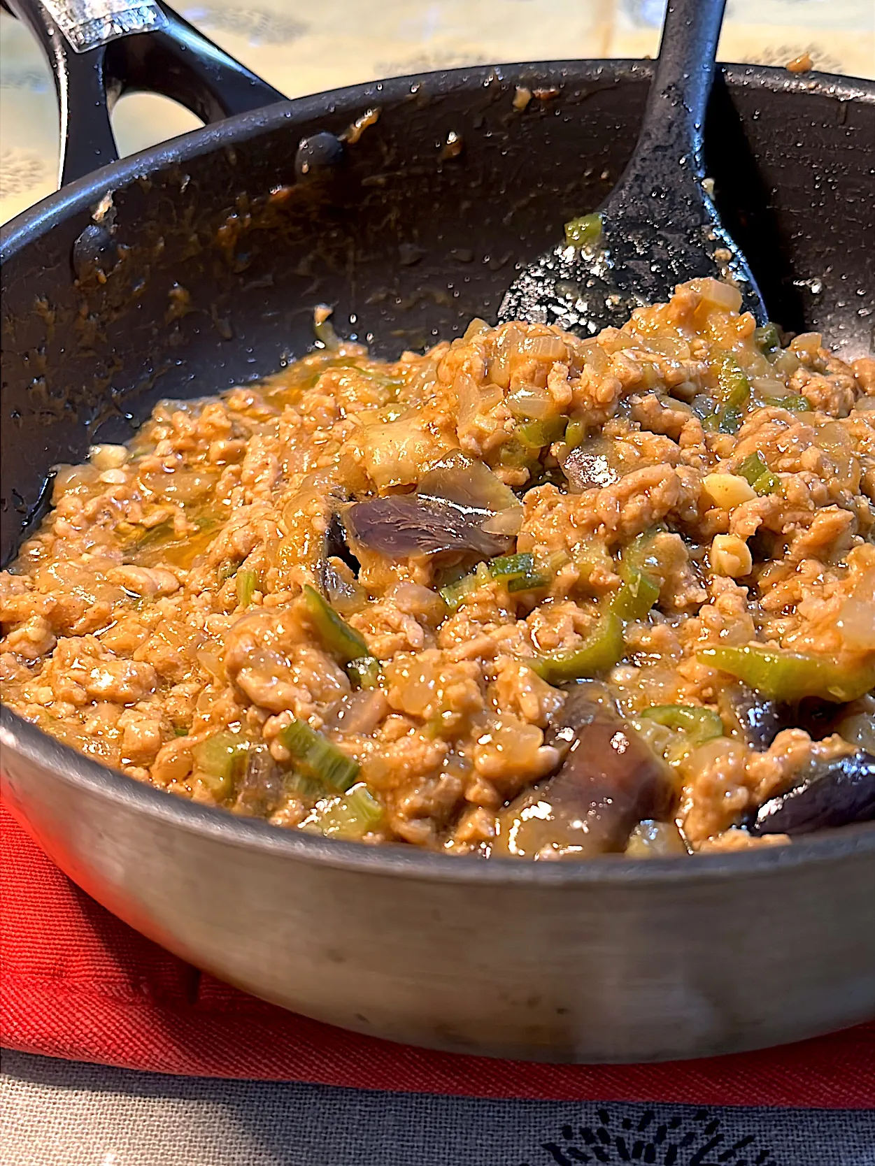 ひき肉を炒める。玉ねぎみじん切り、オクラ(冷凍)、揚げナス(冷凍)も加えて炒める。塩胡椒、酒、みりん、白だし、麺つゆを加えて炒める。