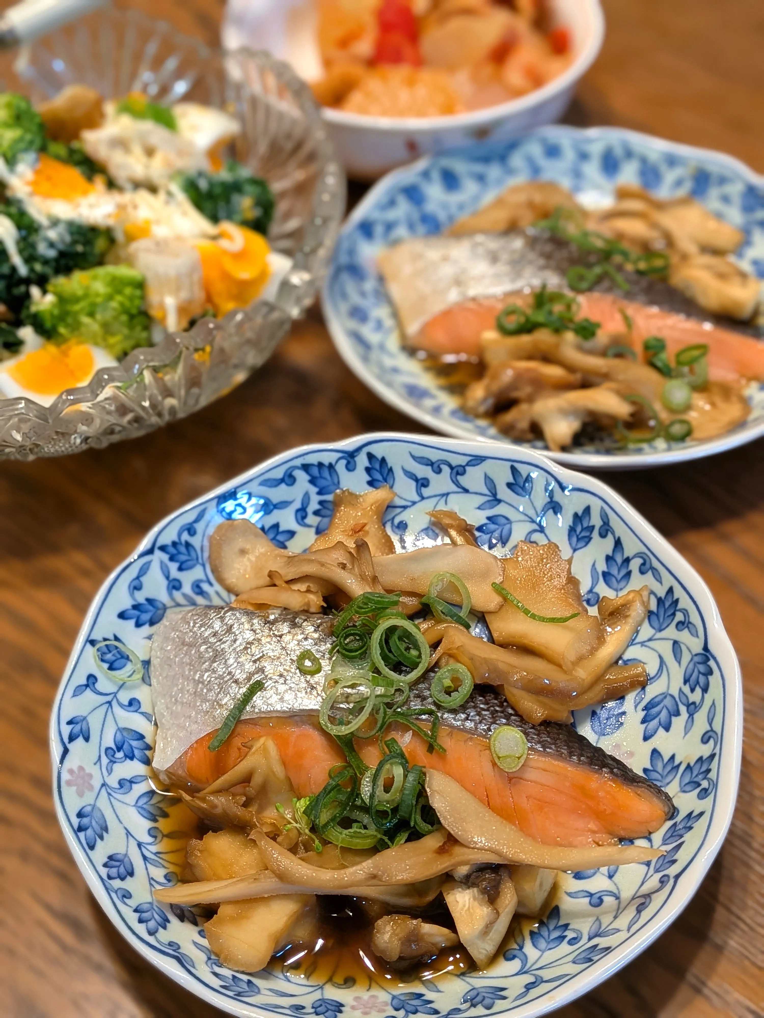 #晩ごはん#夕飯#鮭#舞茸#サラダ#煮物#大根