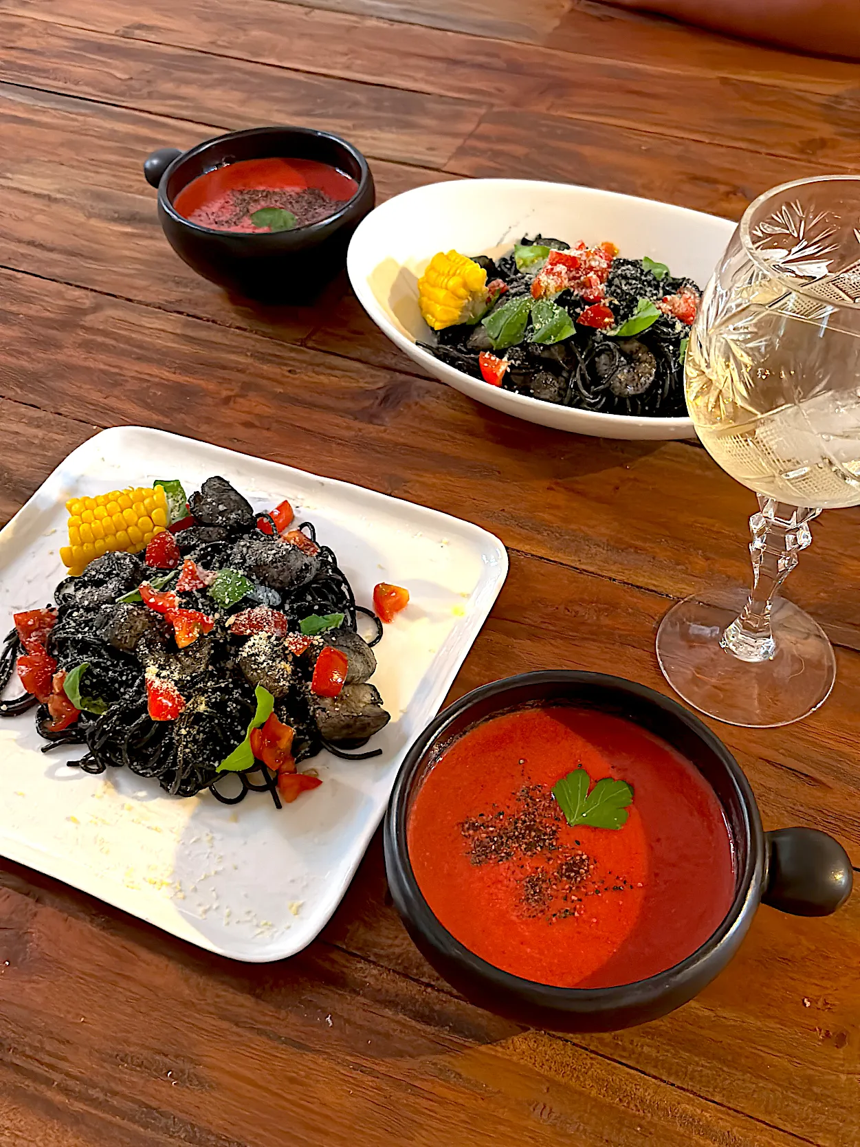 ホタテと海老のイカスミパスタ  ビーツのポタージュ