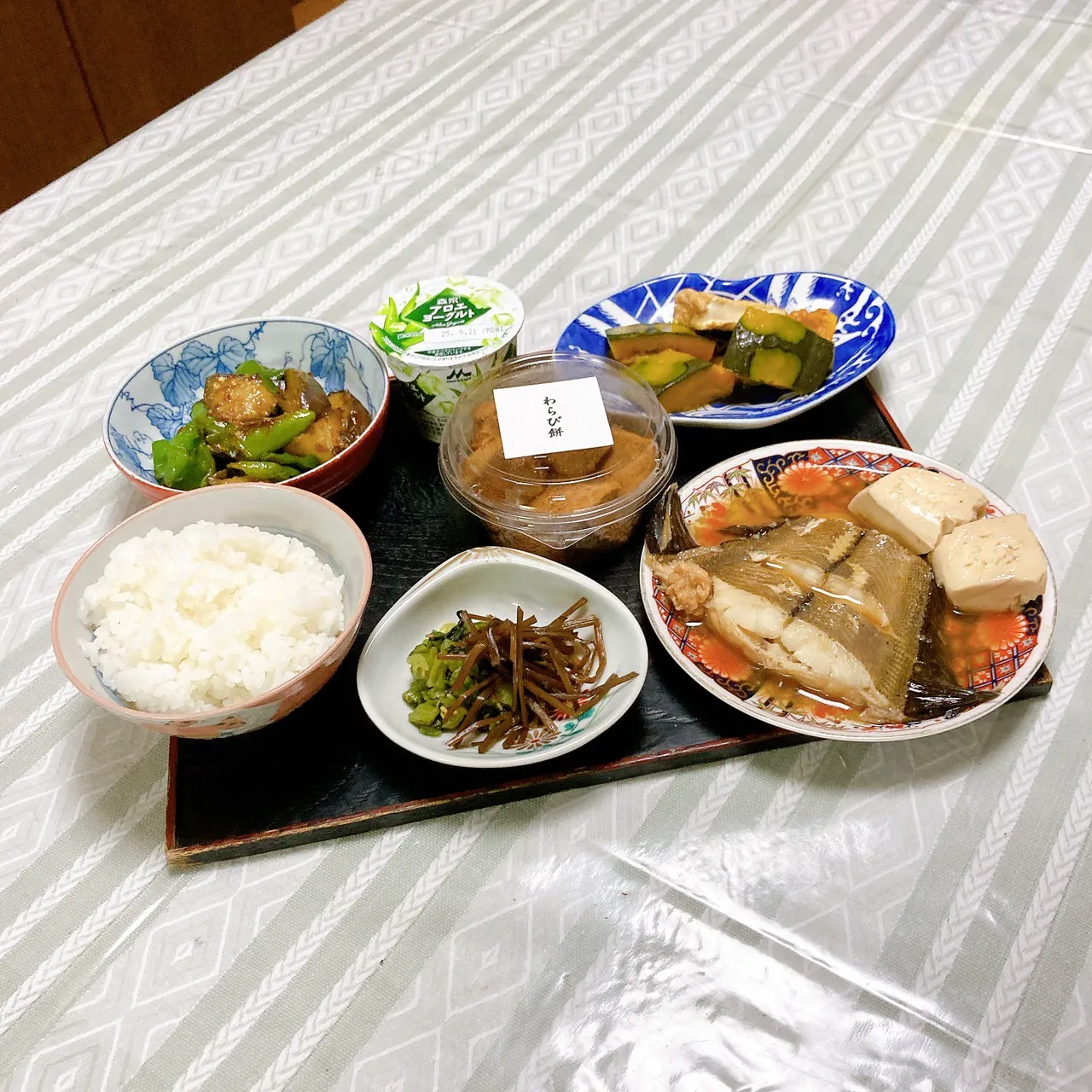 grandmaの晩ごはん☆ 今夜に昨日カレイを煮てたから…茄子とピーマンの味噌炒め…後は残りもので… わらび餅は差し入れで、柏原の木の根橋の前のお餅屋さんのです 頂きます