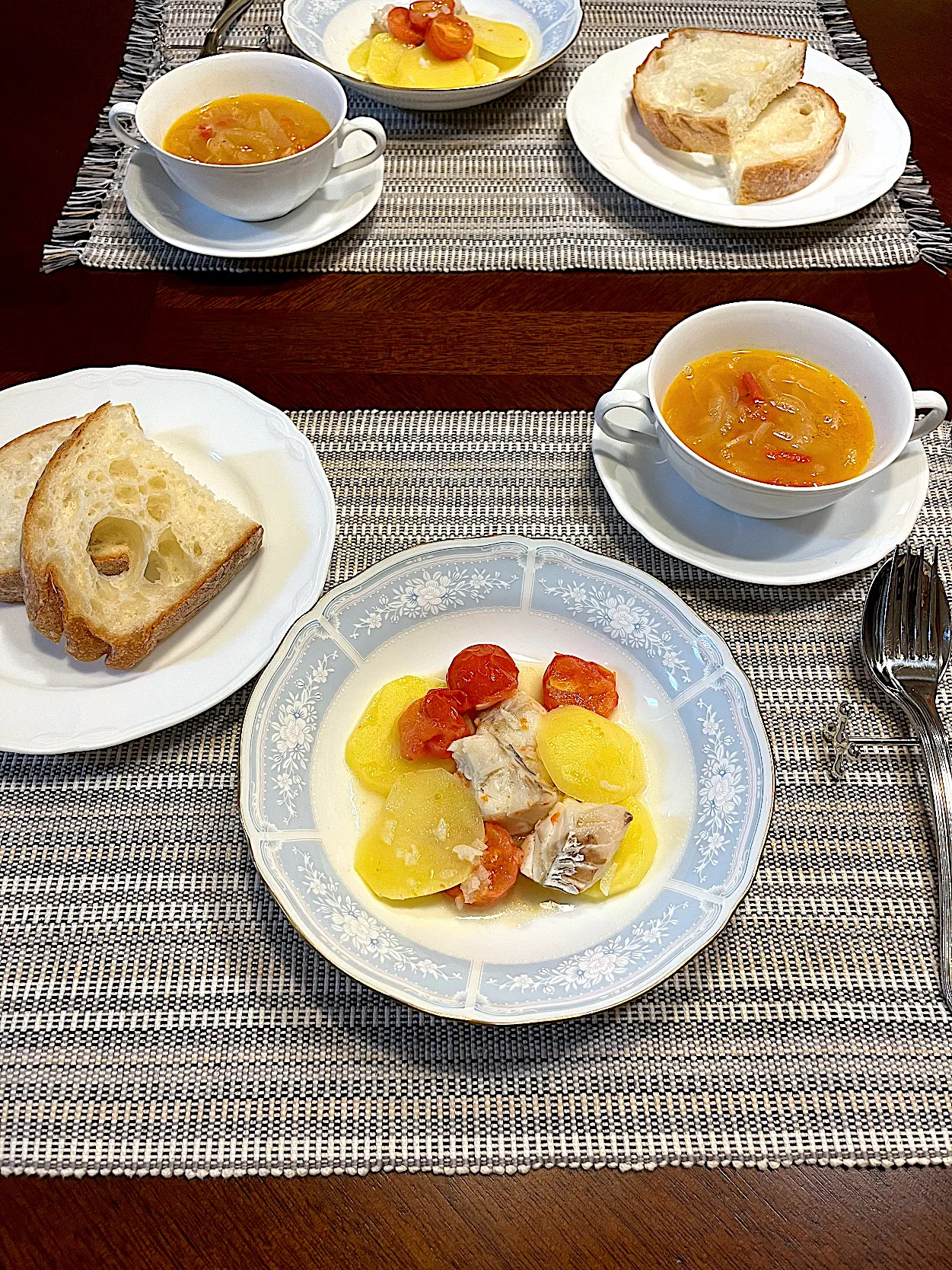 ※タラ…2切れ、じゃがいも…2個、プチトマト…6〜7個に減らして、オリーブオイルも大2は多かったので軽く拭き取りました。タイムもしくはローリエは必ずあった方が良さそう。タラはコメント欄にあったように生タラにして塩を軽く振りました。