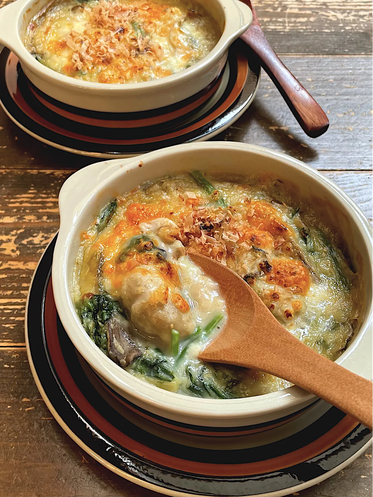 酒蒸しした牡蠣の美味しい蒸し汁は取り分けてつゆの素を加える舞茸は焼き付けるようにソテーほうれん草はゆがいておく蒸し汁入りのベシャメルソースを作り隠し味にふきのとう味噌全て合わせてオーブンでこんがり焼き鰹節をトッピング
