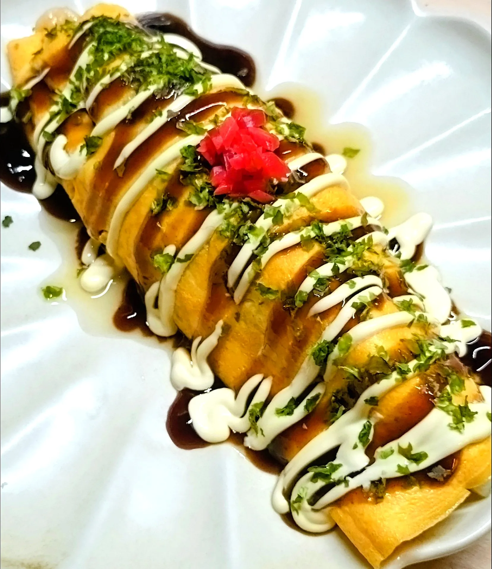 豚肩ロース厚切り肉、いか、えび、舞茸、キャベツの千切りを中華炒めして~卵でくるっと巻きました~(=^・^=)🐾