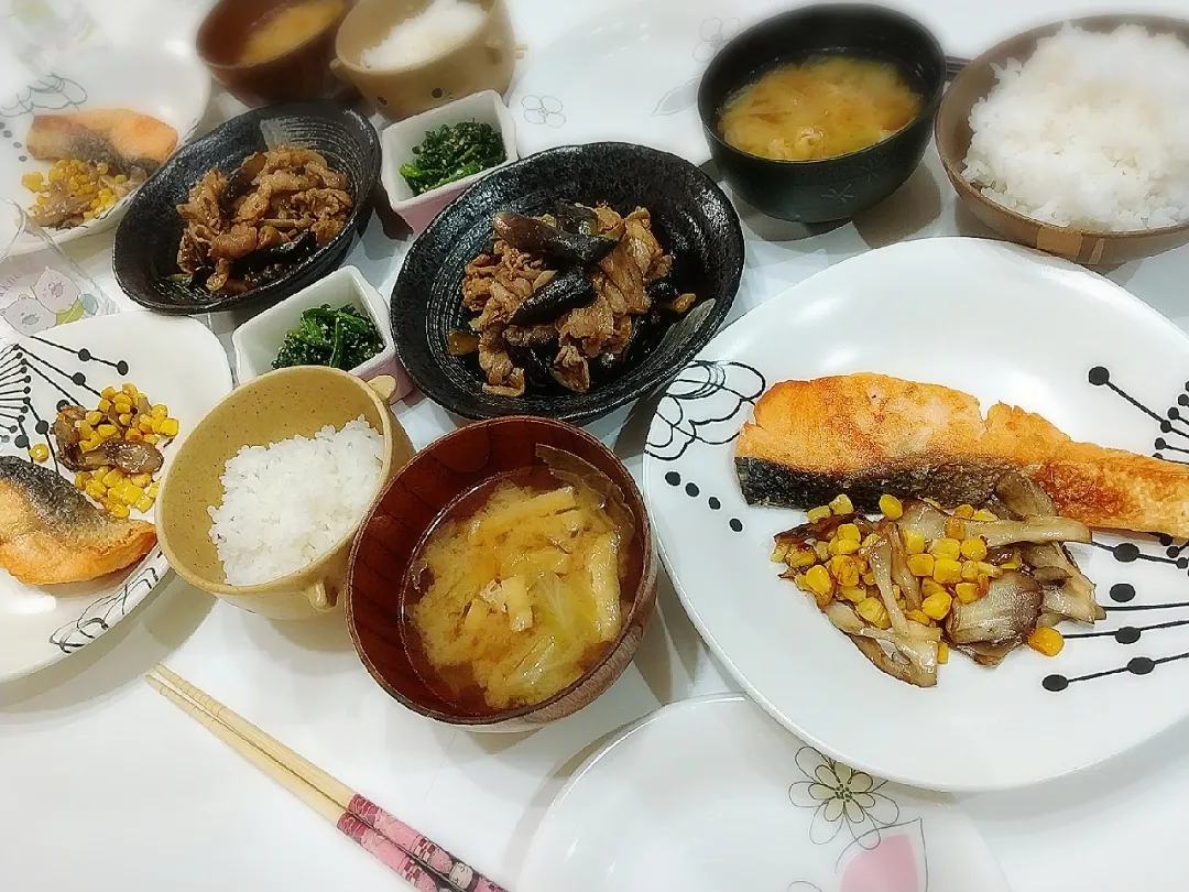 夕食(*^^*) 豚肉とナスとしめじのオイスターソース炒め サーモンソテー&マイタケコーンバター ほうれん草胡麻あえ お味噌汁(キャベツ、油揚げ)