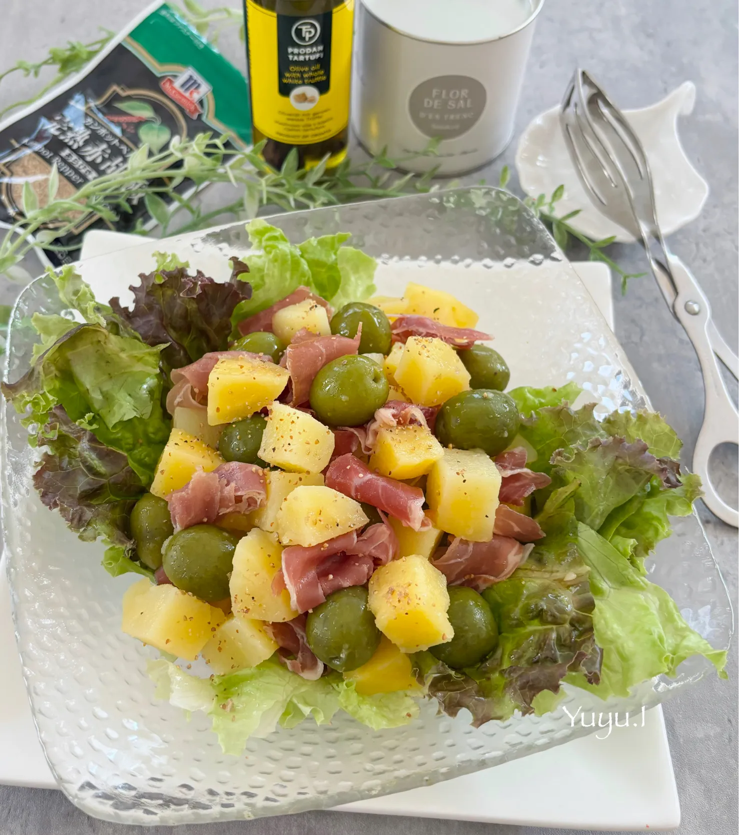 #和え物 #おつまみ #トリュフオイル #スモーク塩 #完熟赤胡椒 #サラダ #じゃがいも #生ハム #オリーブ #グリーンオリーブ #前菜