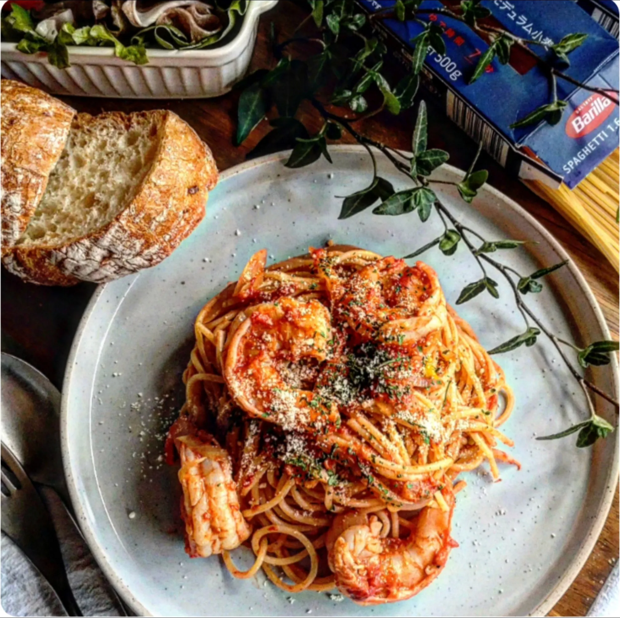 エビとクリームチーズを使ったトマトパスタをつくりました✨