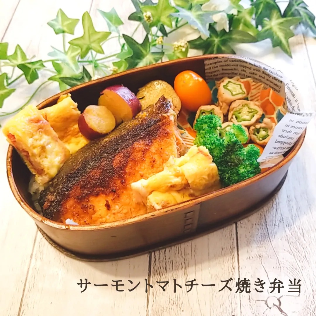 今日のお弁当。 サーモントマトチーズ焼き。オクラの肉巻き。