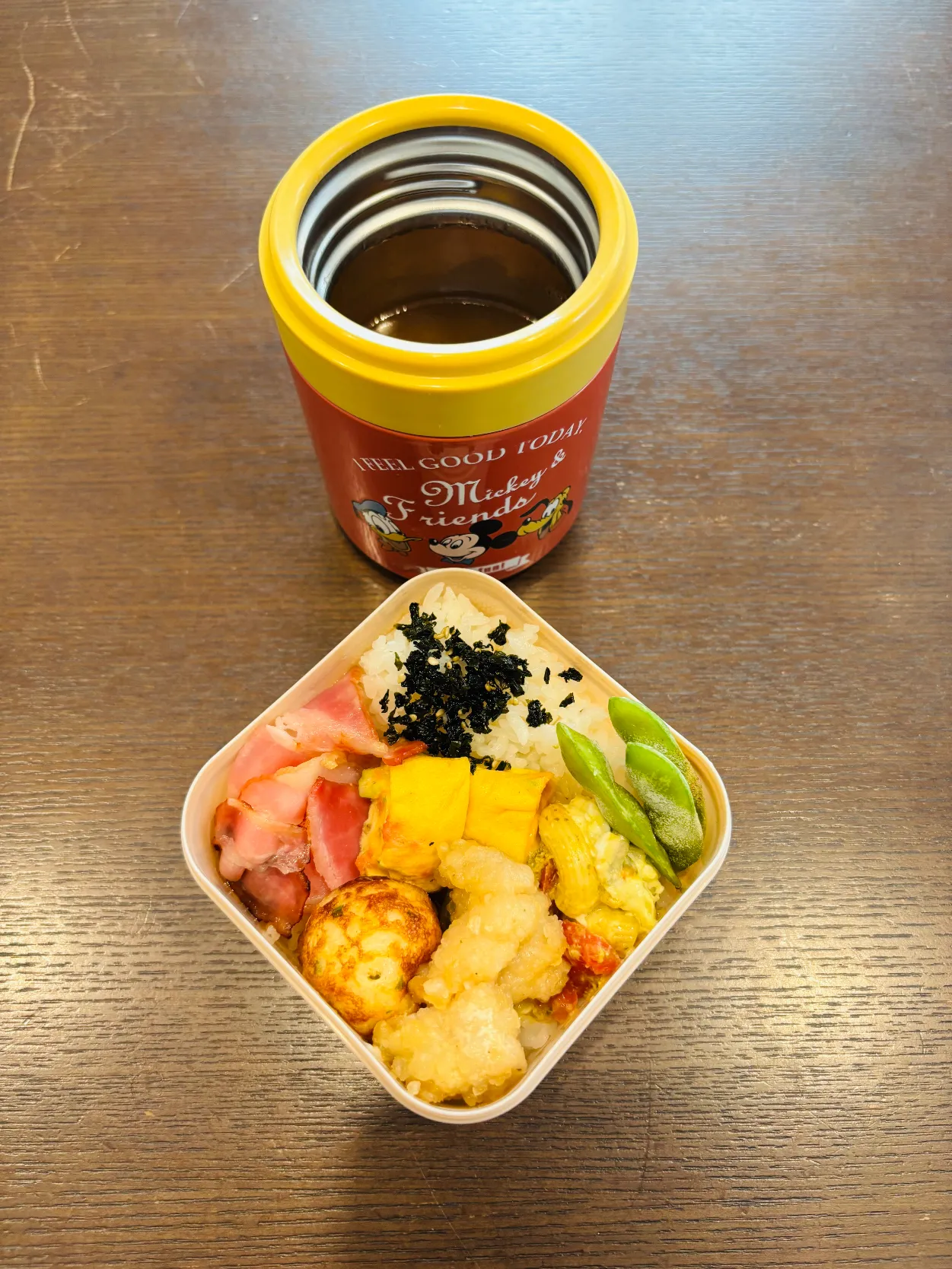 ベーコン、枝豆🫛、唐揚げ、たこ焼き、鮭卵焼き、アボカドサラダ🥑、しそわかめふりかけごはん、けんちん汁。