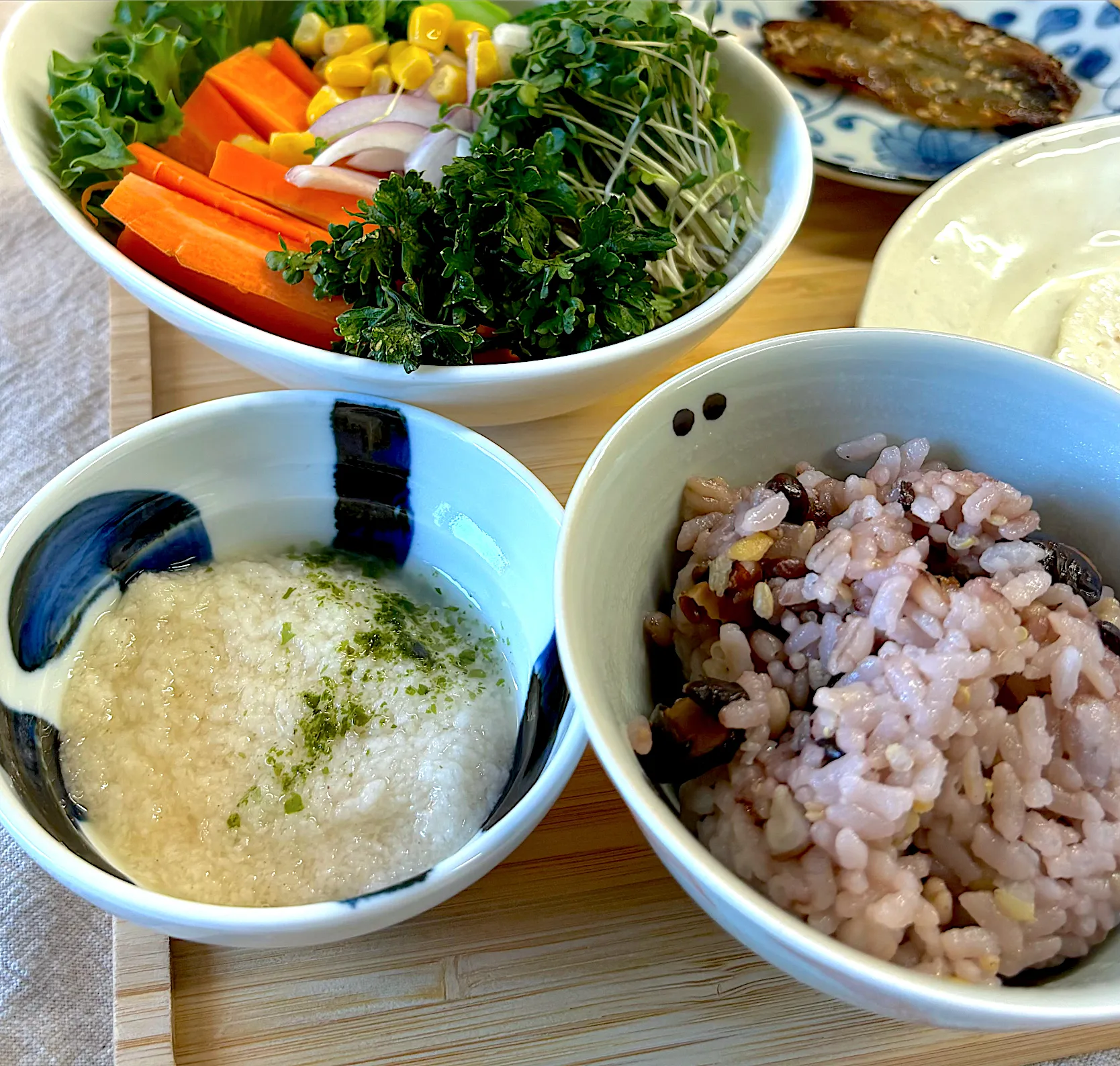 主人の朝ごはんに小盛りの雑穀ごはんと少しだけとろろ🥰 #かっちゃん杉 #かっちゃん杉の朝ごはん #とろろご飯