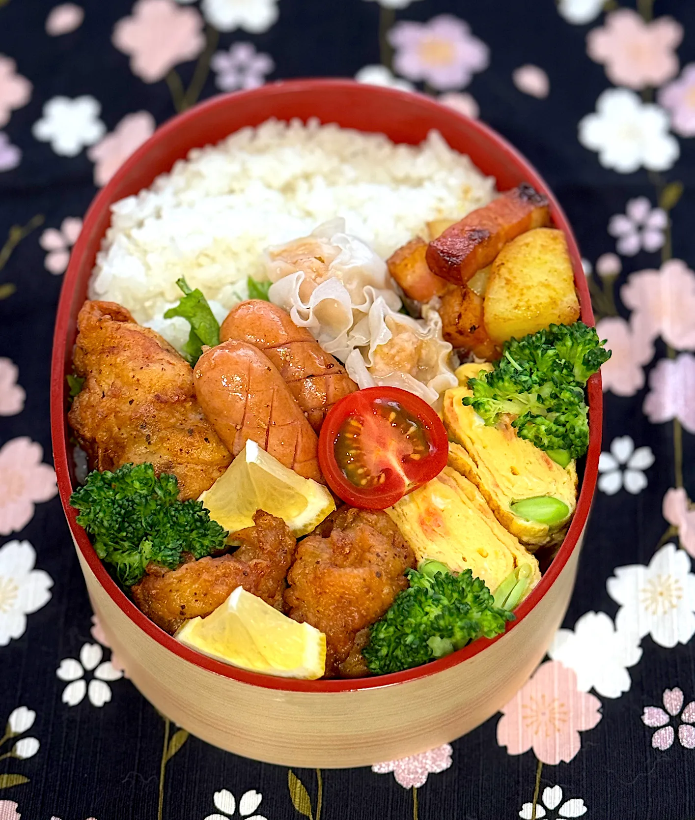 #唐揚げ #桜えびと枝豆のだし巻き #じゃがいもとベーコンのカレー炒め #ウインナー #冷凍焼売 #ブロッコリー #ミニトマト #お弁当 #野球部弁当 #男子高校生弁当 #白米 #曲げわっぱ #わっぱ弁当
