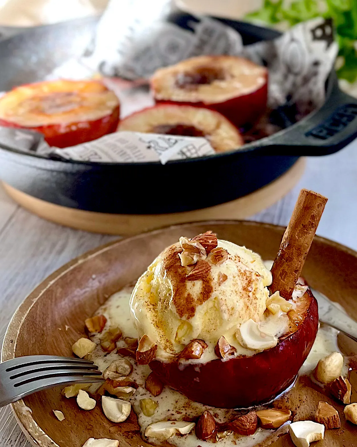 熱々の焼きりんごにバニラアイスを乗せてナッツをパラパラ〜♪