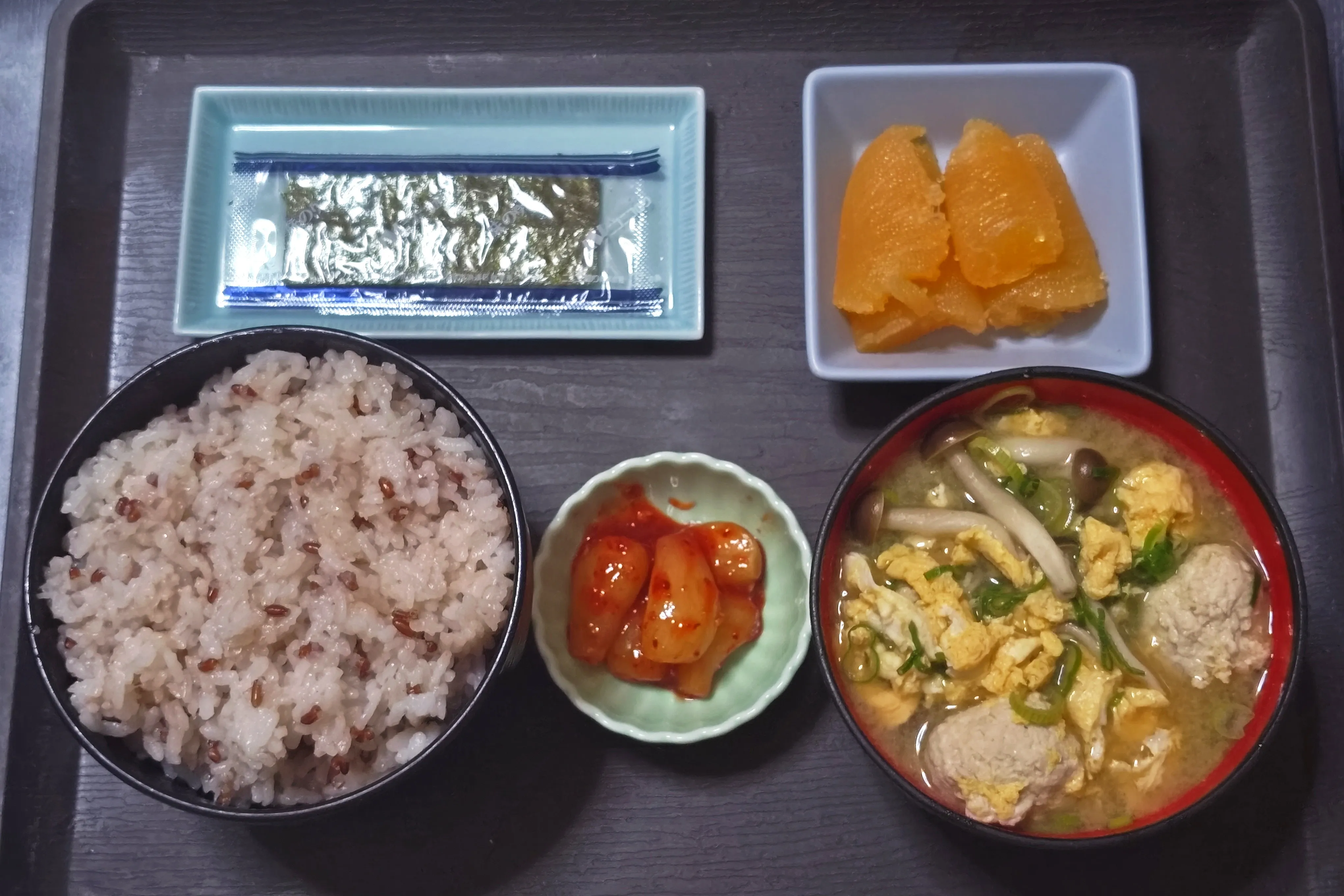 今日の朝ごはん(赤米ごはんに味付け数の子、味付けのり、つくねと卵のみそ汁、岩下のらっきょうキムチ)