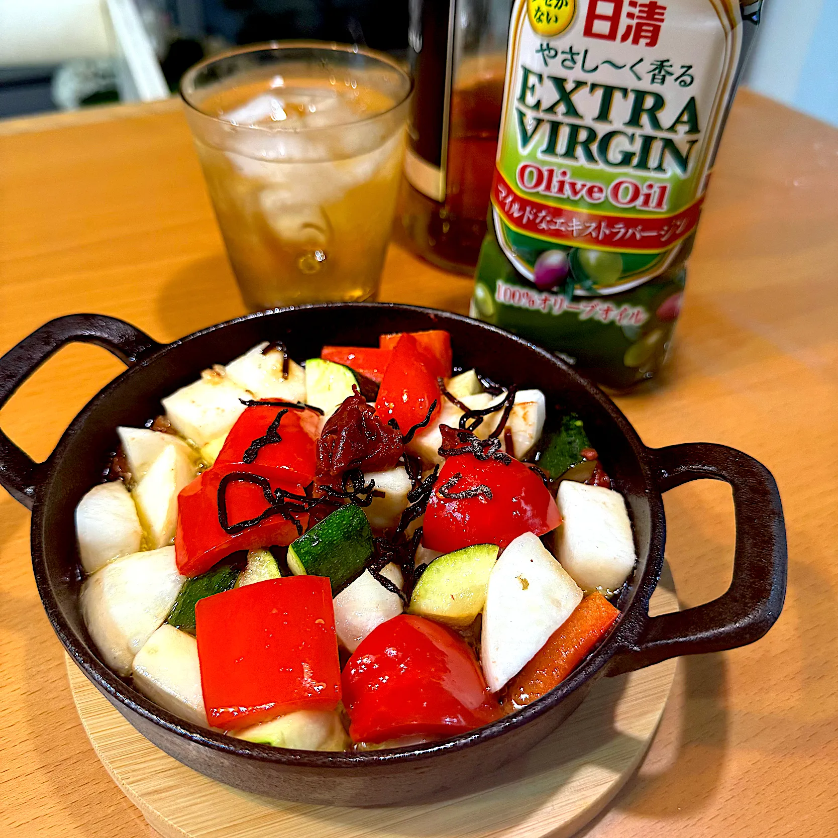 梅干しはオリーブオイルでなんだかフルーティになりました。塩昆布のうま味がお野菜を迎えてくれてとっても美味しい。気取らず、ハイボールと合わせました!うまうまっ