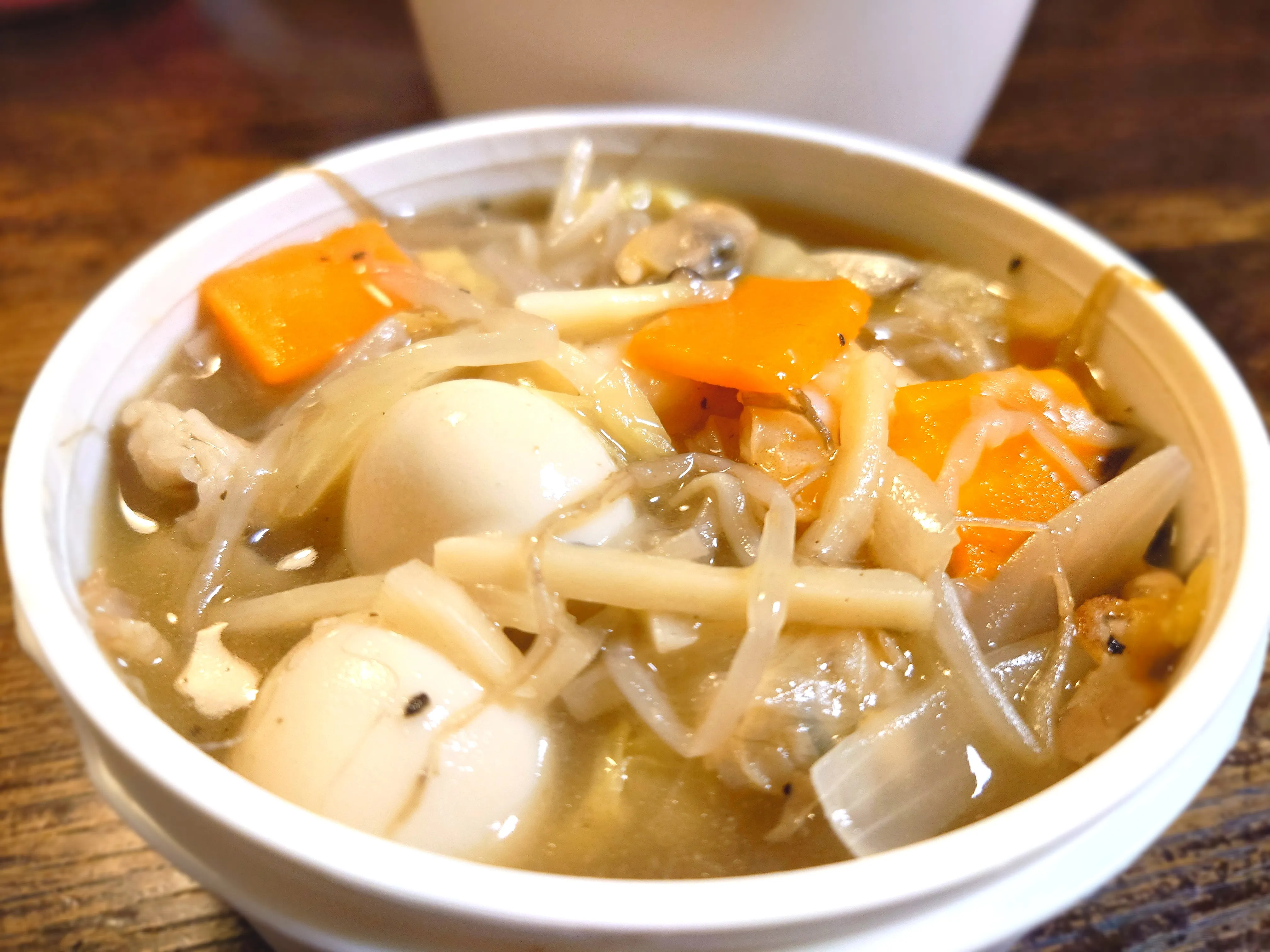 具材は、にんじん、白菜、椎茸、たけのこ、もやし、ウズラの卵、豚バラ、えび、あさり、イカです。