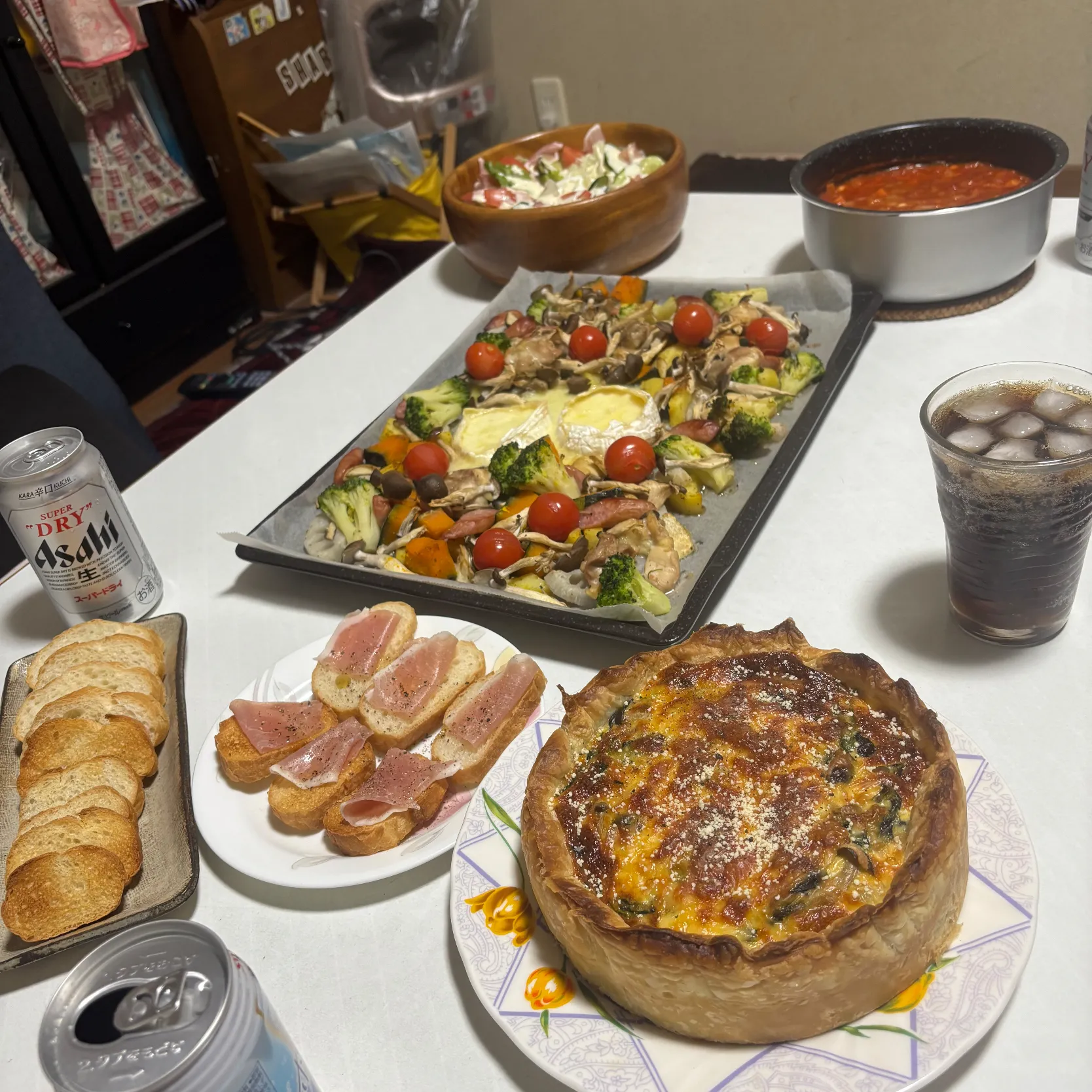 #料理記録 #料理男子 #料理好き#手作り #晩酌 #夜ご飯#クリスマス#パーティ#キッシュ#ぎゅうぎゅう焼き#オーブン#シーザーサラダ#ミネストローネ#バゲット #ビール