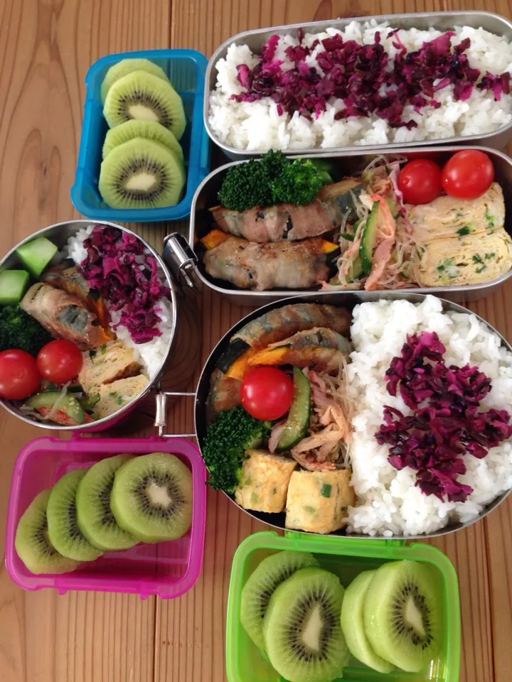 南瓜豚バラ巻き 春雨サラダ ネギとシラス入り玉子焼き ブロッコリー ミニトマト キウイ