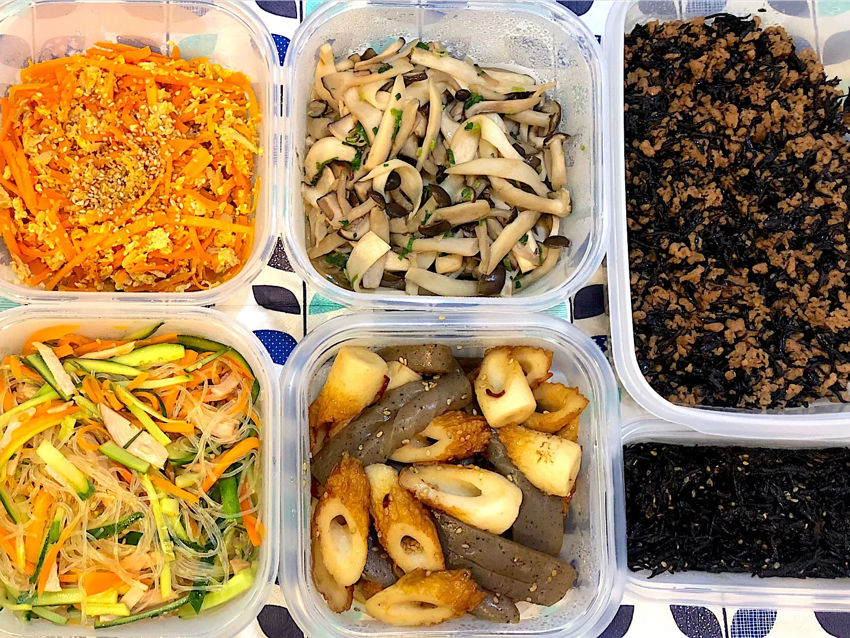 ☆★8.26休日に作る常備菜★☆①ツナと人参のしりしり②簡単無限きのこ③ひじき入り豚肉のそぼろ④サラダ春雨⑤こんにゃくとちくわ煮⑥ひじきの梅肉和え♪