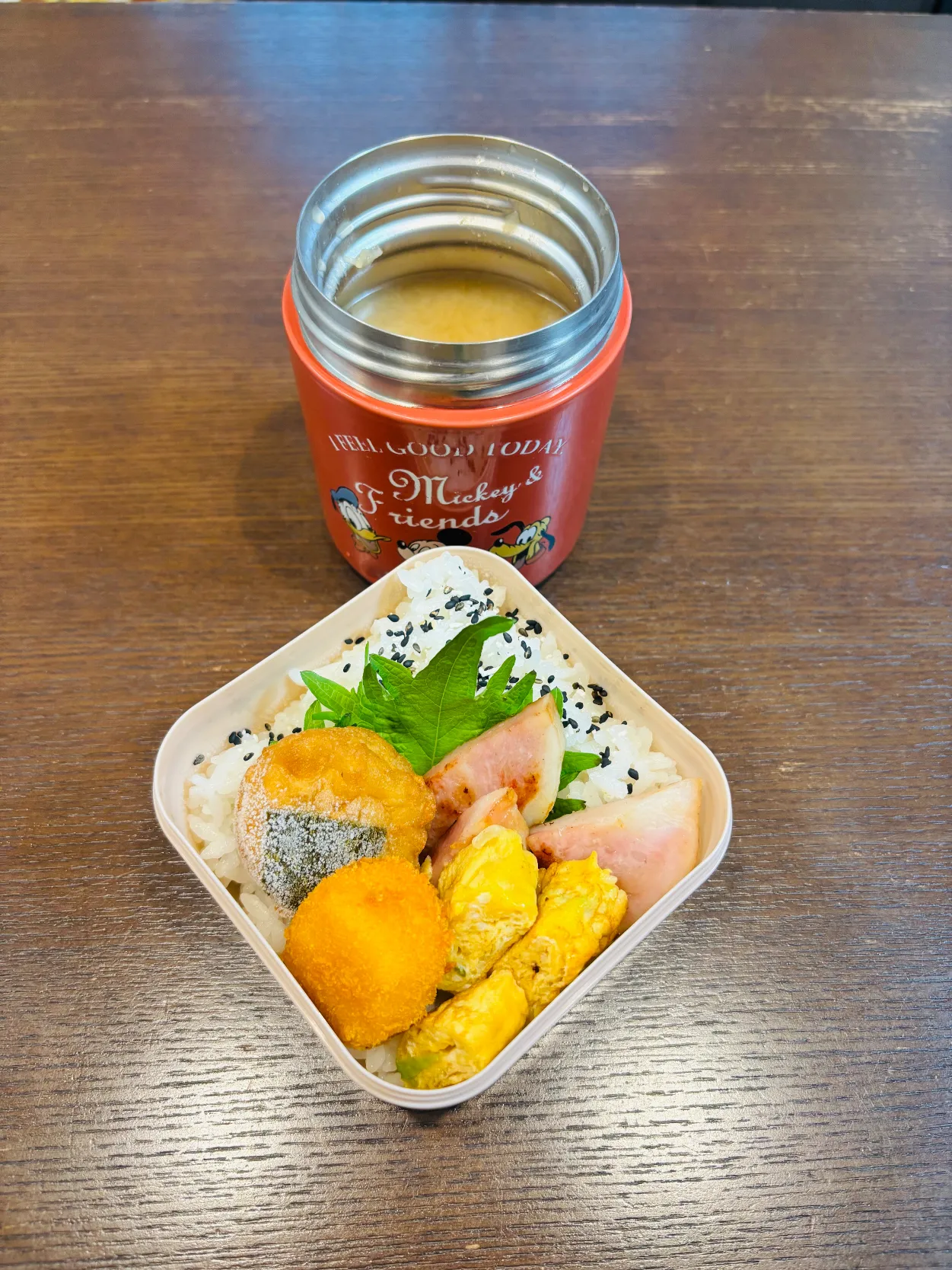 ハム、キャベツチーズ卵焼き、のりっこチキン、コーンクリームコロッケ、紫蘇、ごま塩ご飯、ツマのみそ汁。