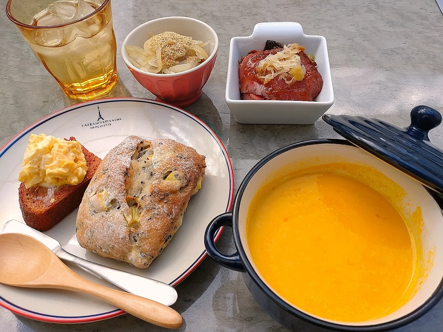 パンはライ麦高配合パン(たまごサラダ乗せ)、黒ごま&さつまいものリュスティック、という寄せ集めでした。