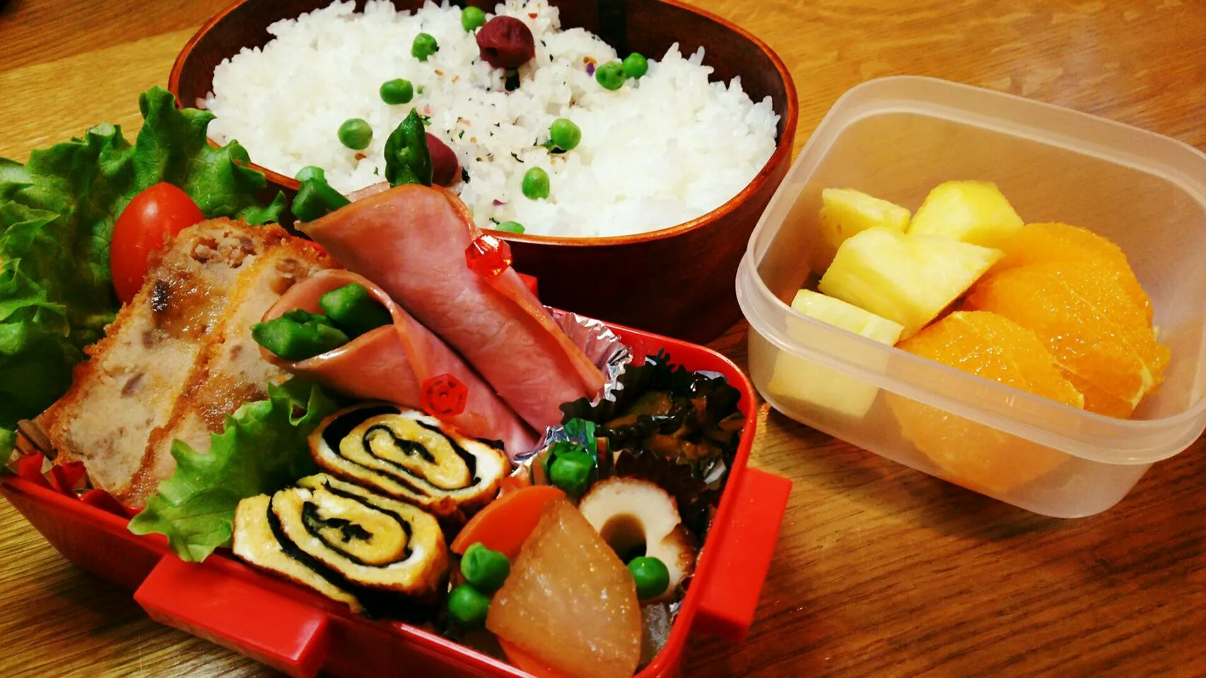 父ちゃんの今日のサラメシ コロッ、コロッ、コロッケ~♪ #大根と竹輪の煮物 #アスパラハム巻きマヨソース #海苔玉巻き