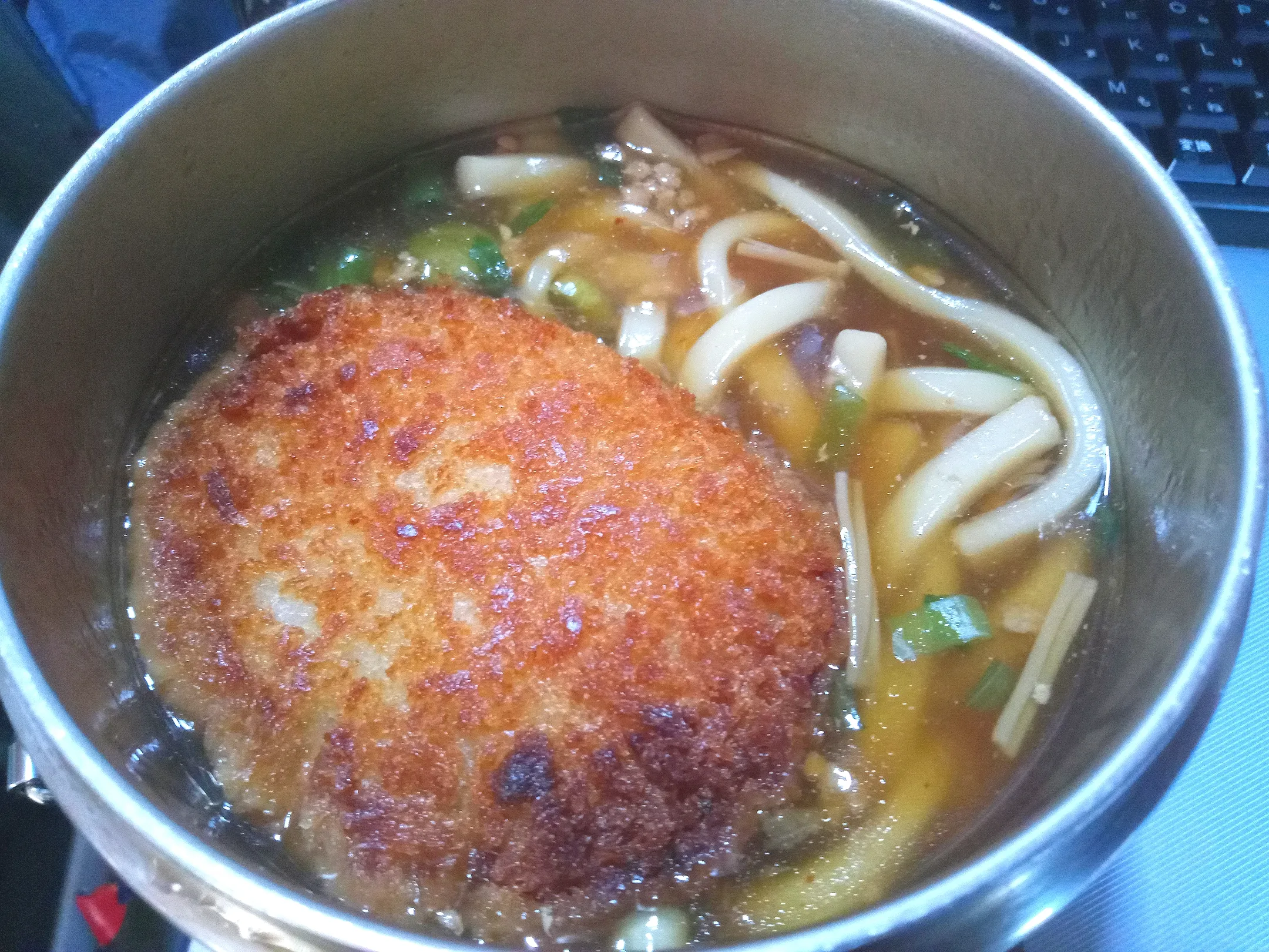 おそようございます。おそようのおなじみの理由で、郵便発送と買い出しに出てました。8時頃食べた朝食は、昨夜の家族の夕食だった手羽元煮込みの残り汁にとろみを付けてうどんを煮て、コロッケを乗せました。コロッケと甘辛味は結構合うものです。美味し。