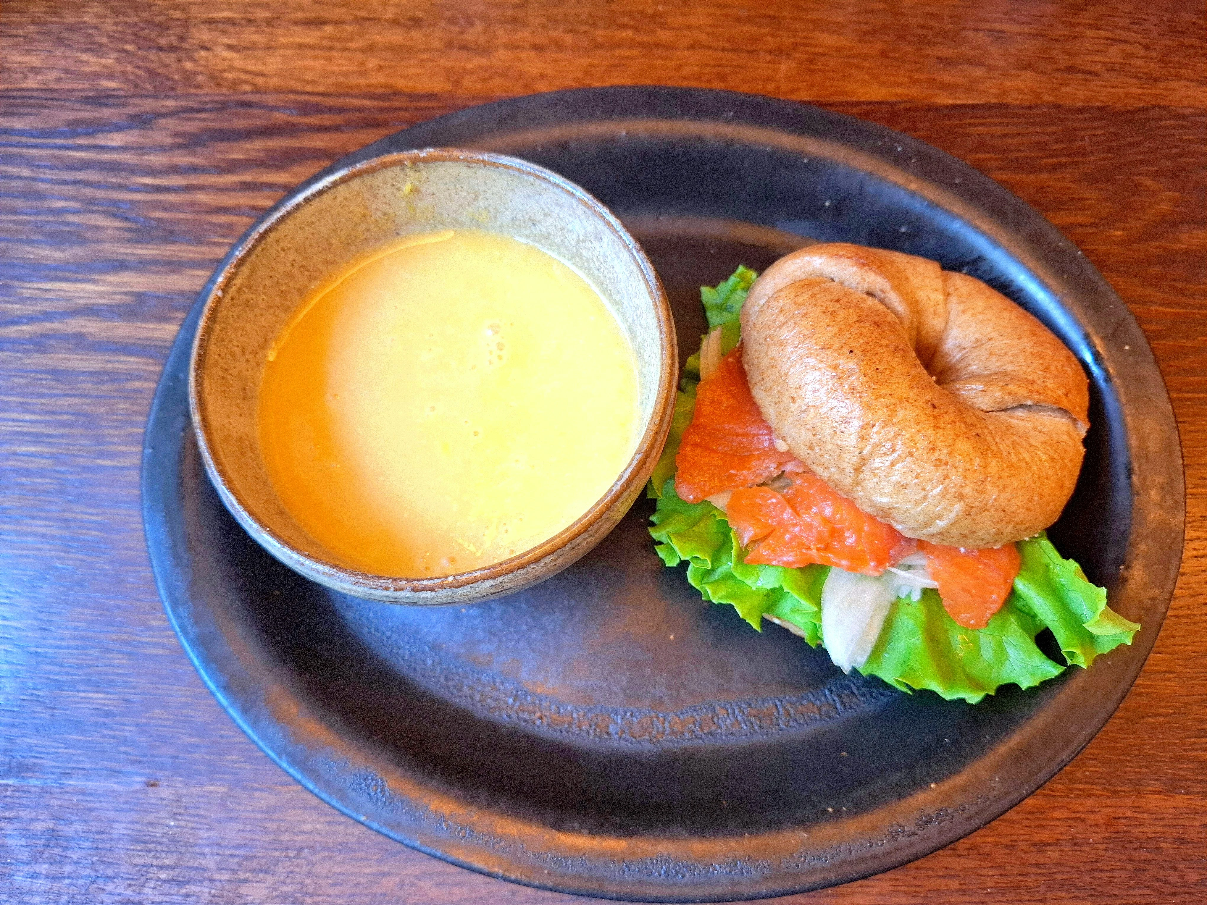 金剛山の水で練りあげたモチモチベーグル サーモン バジルクリームチーズサンドと、バターピーナッツカボチャ🎃ポタージュ