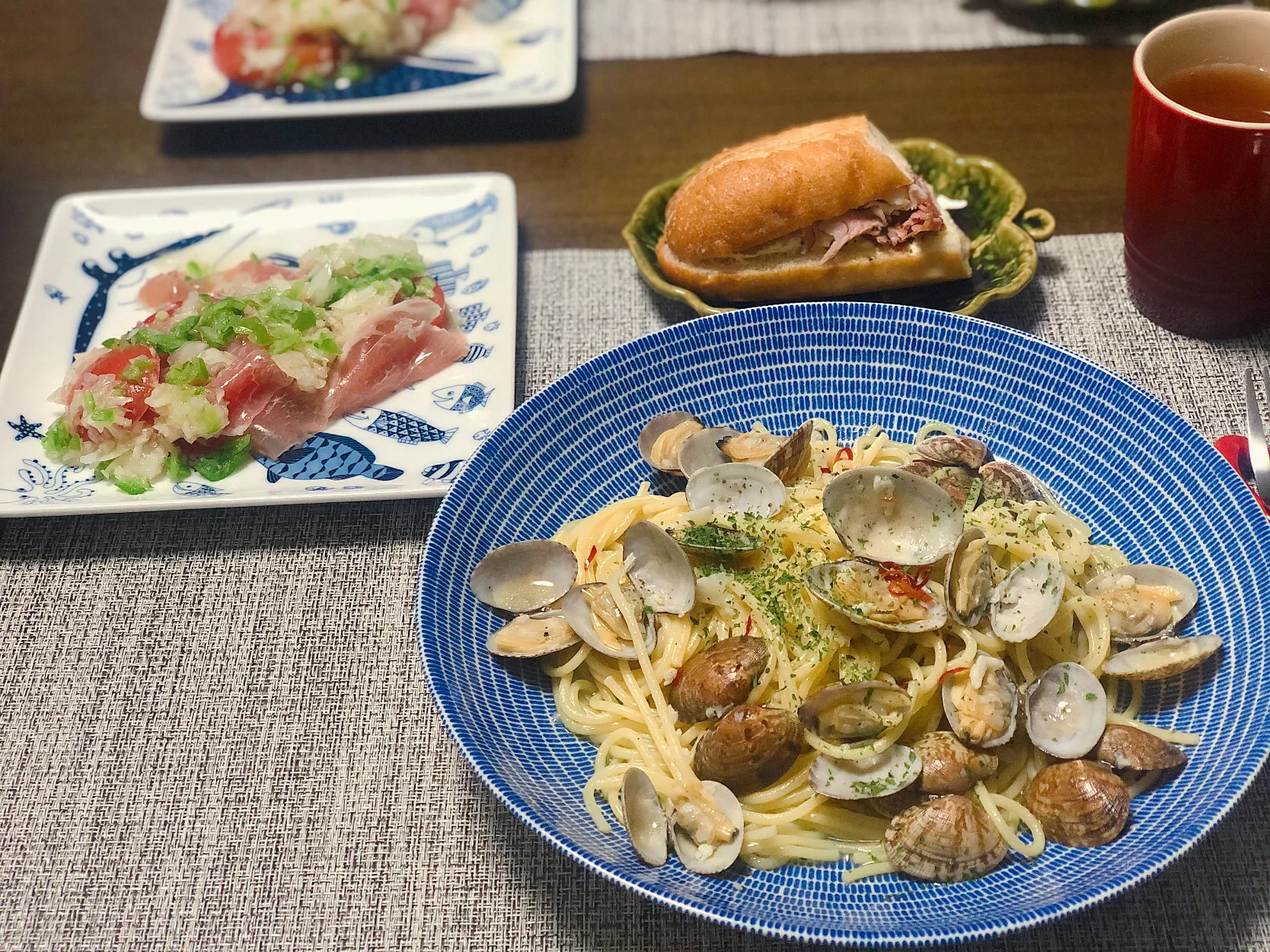 ボンゴレビアンコ・生ハムとトマトのマリネ🍅