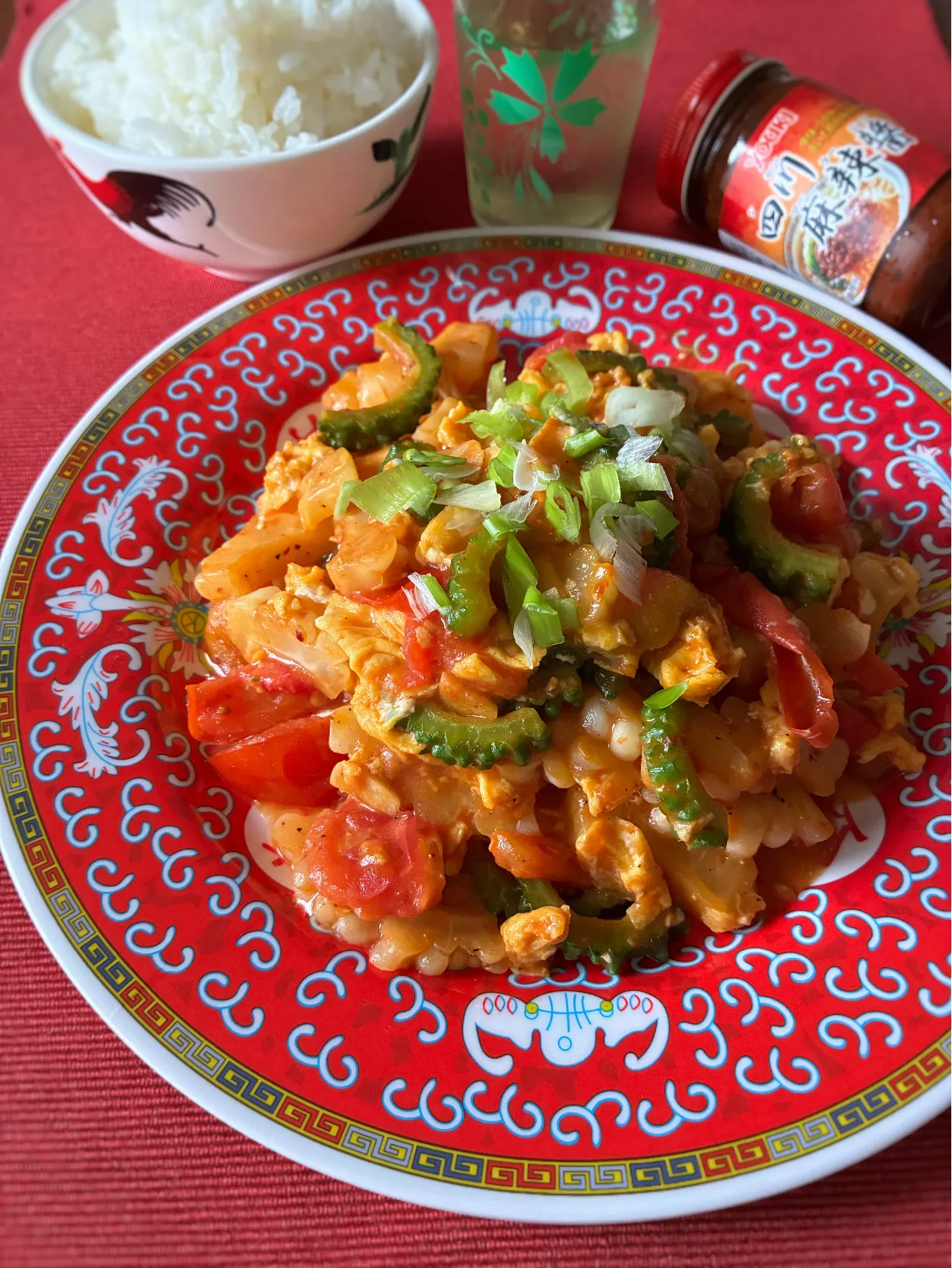 で、今朝はトマ玉にゴーヤーを加えて四川麻辣醤でピリ辛シビ辛に仕上げました💪