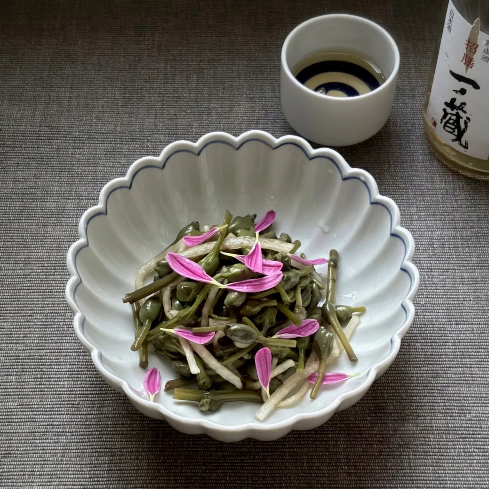 #和食 #和え物 #山菜 #ミズ #ミズ玉 #ミズコブ #ムカゴ #食用菊 #エディブルフラワー #紅もって #もって菊 #おつまみ #日本酒 #日本酒レビュー #酒レビュー