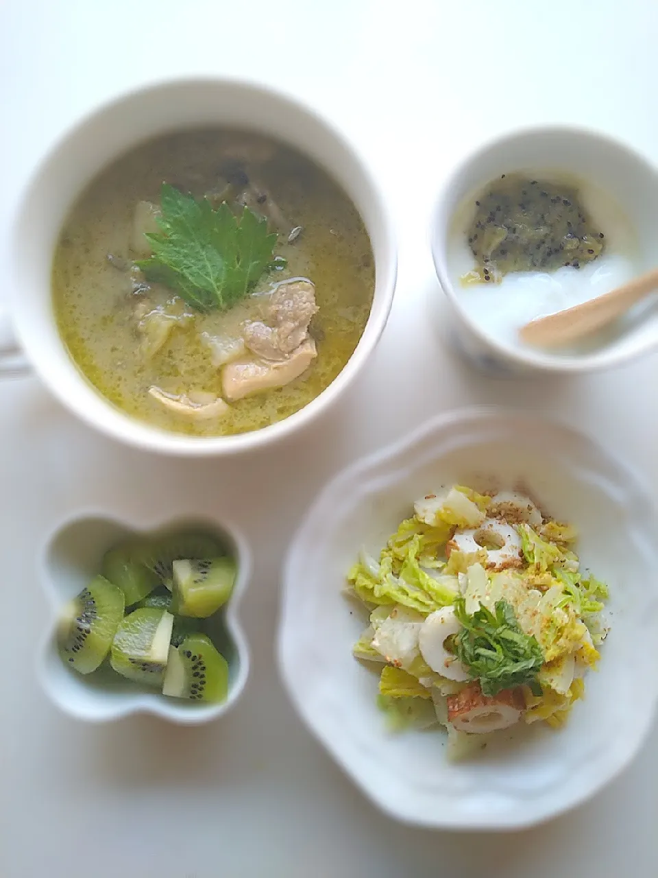 #グリーンカレー #サラダ #キウイ #ヨーグルト #朝ごはん #緑