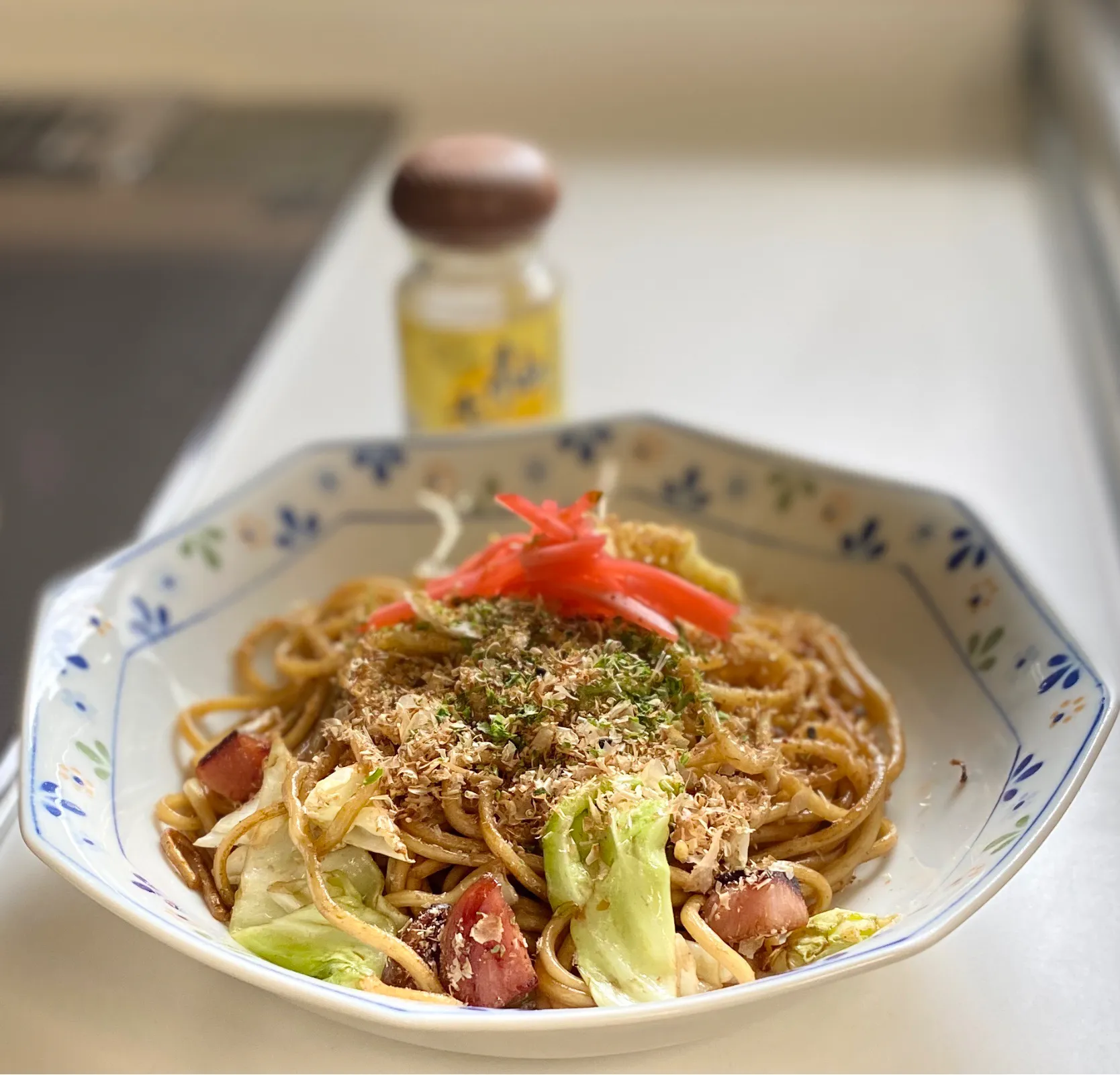ベーコンとキャベツの和風焼きそばです。仕上げに柚子胡椒!ピリッと美味しいです。娘と私の昨日のお昼ご飯です。