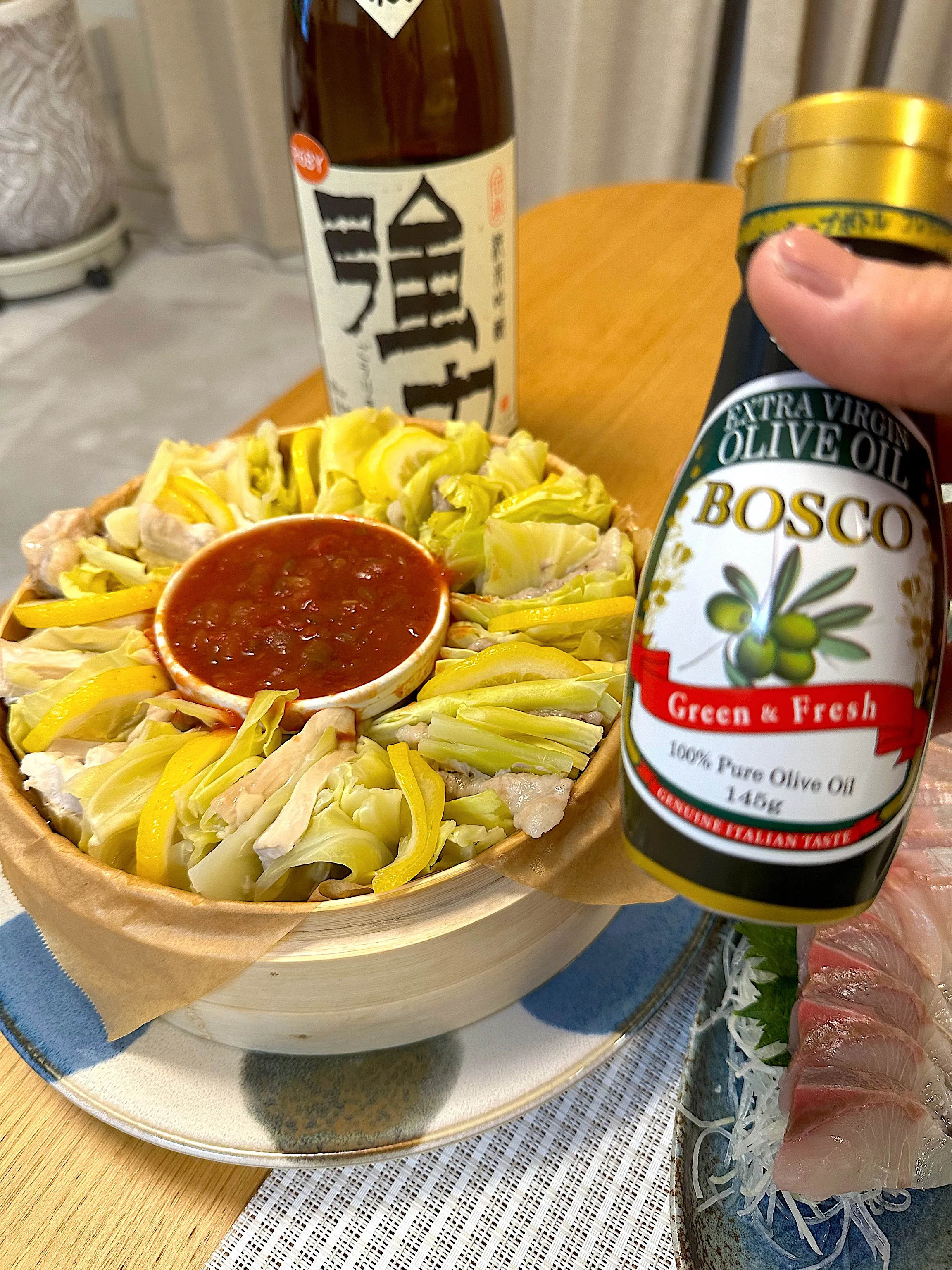 日清オイリオ様、スナップディッシュ様、ありがとうございました😊むね肉と、豚バラの蒸しにエキストラバージンオイルをかけたら〜いつもと違う美味しさ♡オイルをかけたらなんと〜美味しさが増す〜キャベツ🥬の甘さとオイルをかけることでフォアグラを食べているような味に😊
