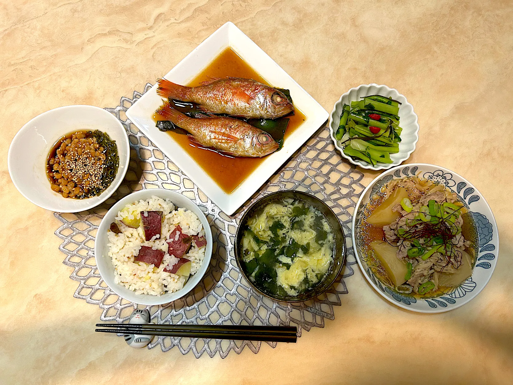 お夕飯 鰹のたたき・カボチャサラダ・厚揚げお好み焼き...