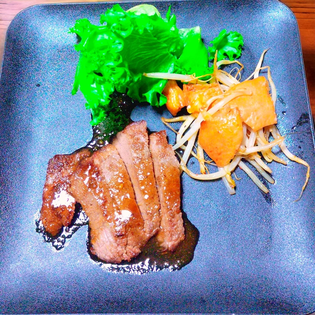 oneプレート  娘用の夕食メニュー ステーキ お手製のソース ホルモン炒め