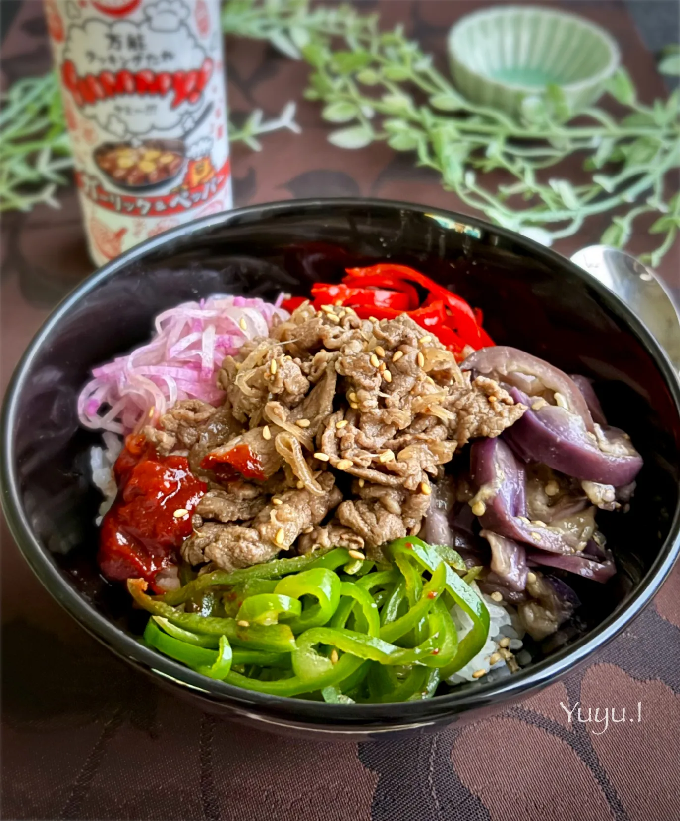 #ビビンバ #プルコギ #牛肉 #ナムル #なす #ピーマン #赤ピーマン #紅大根 #淡紅大根 #丼 #ご飯 #韓国 #夏
