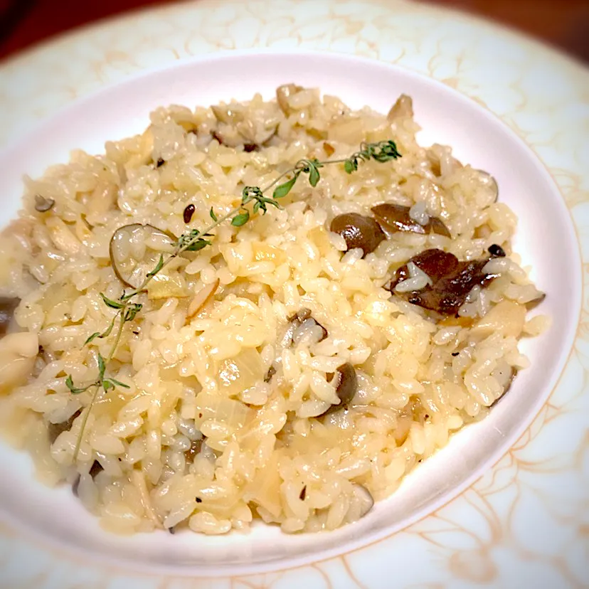 きのこのヘルシーリゾット シンプルにニンニク、たまねぎ、きのこ達、オリーブオイル、白ワイン、コンソメ、粉チーズと最小限の調味料と具材で、アルデンテに仕上げました❣️