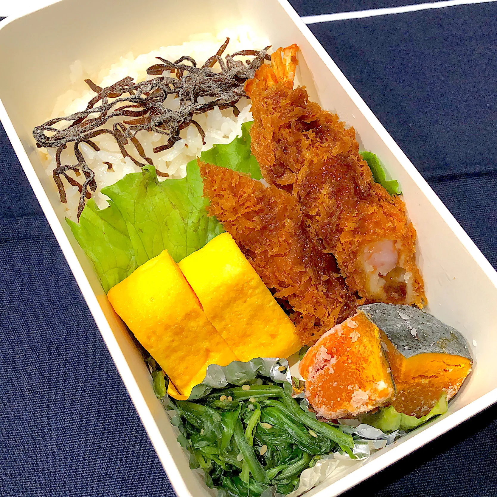 塩昆布ご飯、たまご焼き、エビフライ、ほうれん草胡麻和え、蒸しカボチャ
