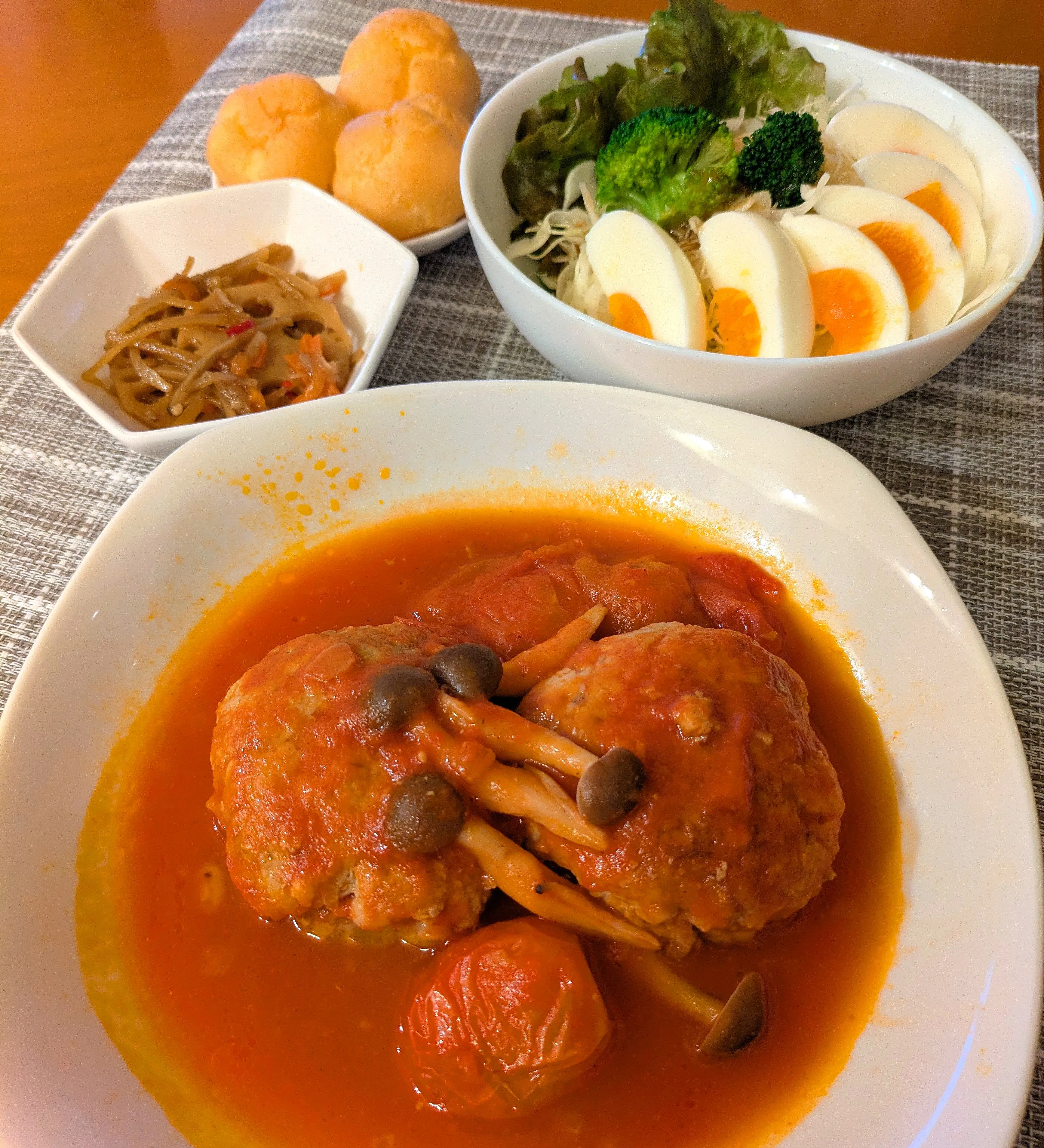 #夕食#トマト煮込み#ハンバーグ#サラダ#きんぴら#シュークリーム