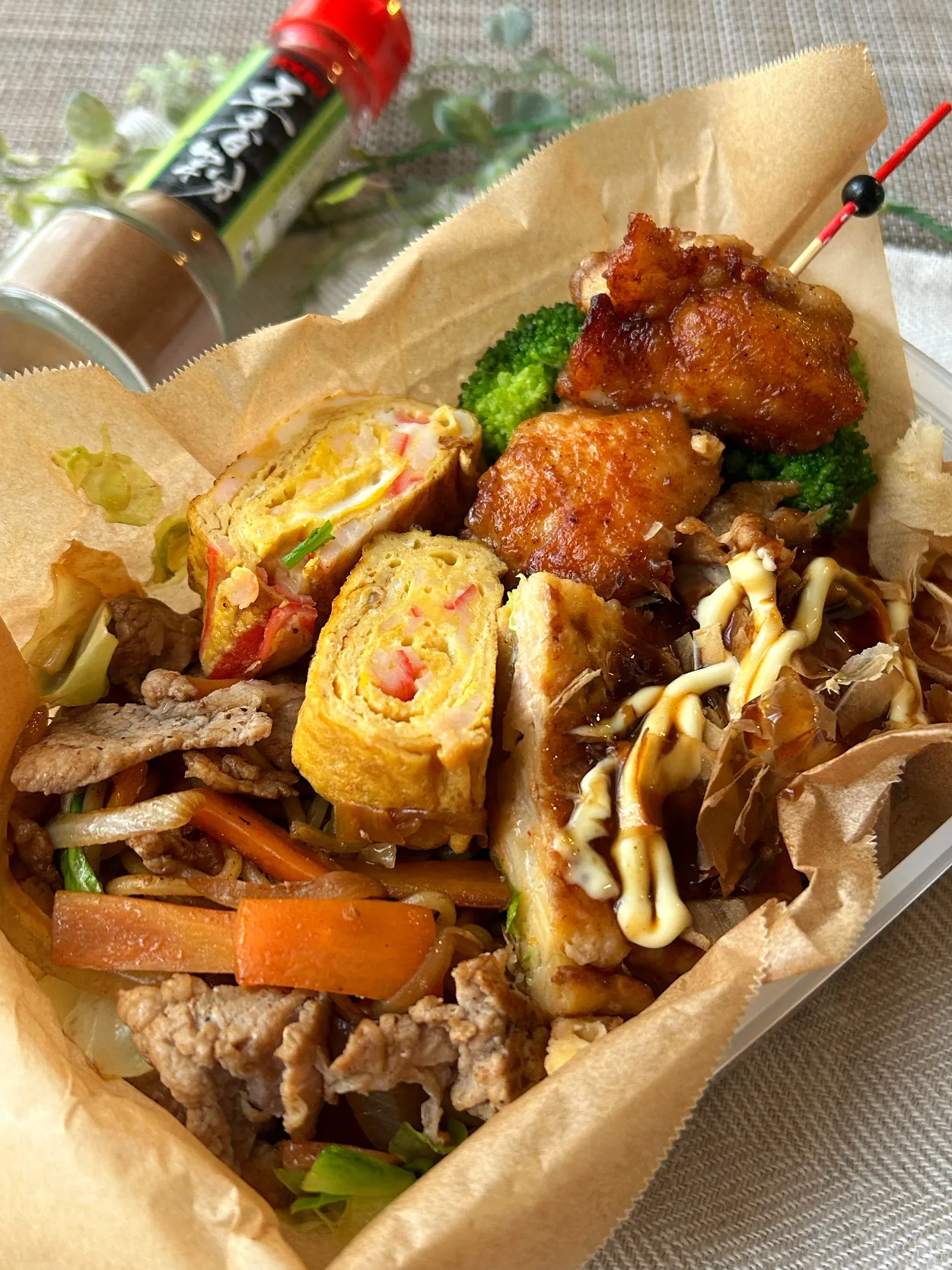 お好み焼きは前の日に焼いて置いたから朝焼きそば炒めるだけで、実はカンタンな手抜き弁当だよ(*´艸`)