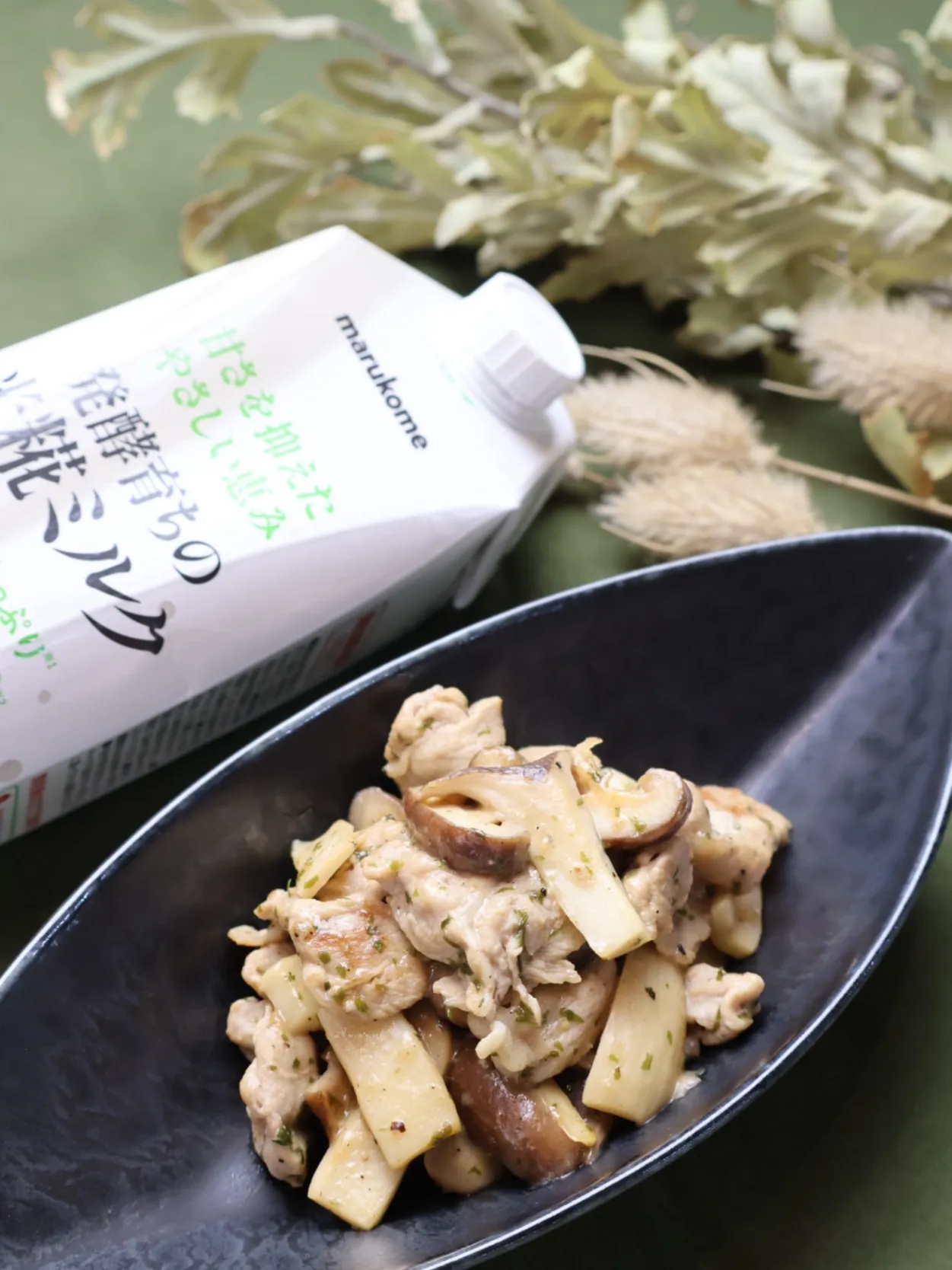 レモン汁と塩胡椒をして、米糀ミルクを加えて、水分が無くなるまで煮詰める。