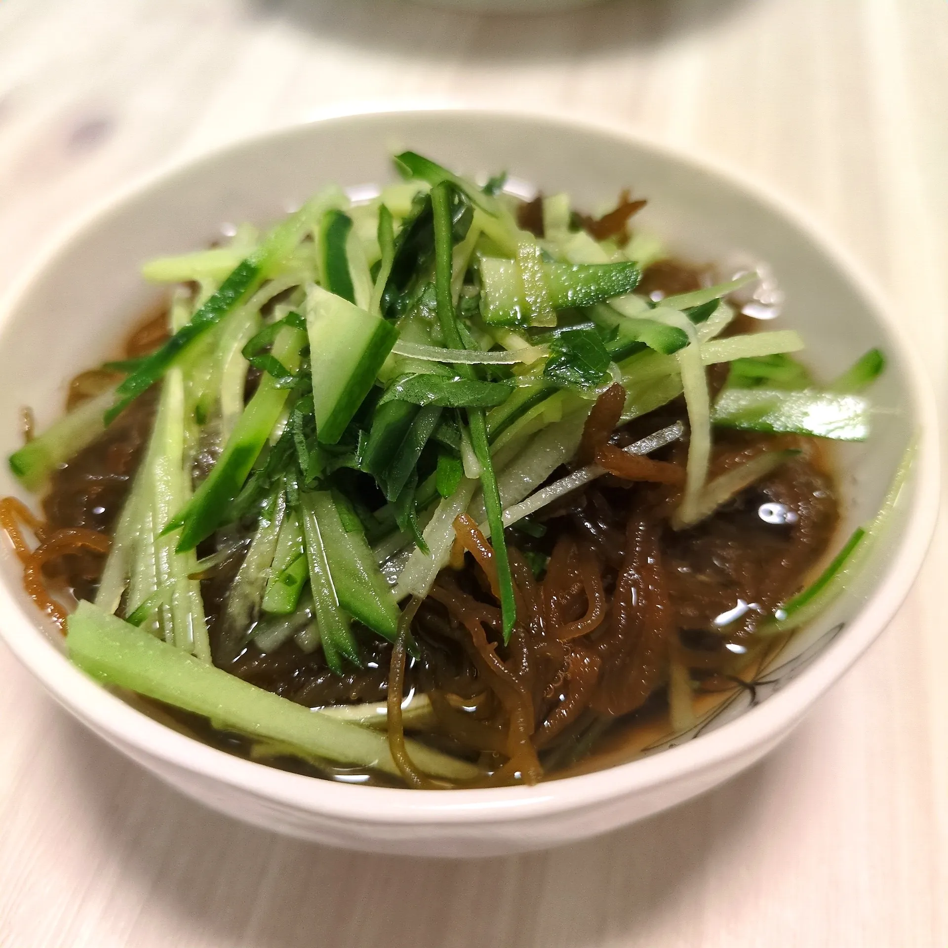 生もずくが売ってたのでお酢とだし醤油で☺きゅうりのシャキシャキともずくがとってもいい感じ🩷