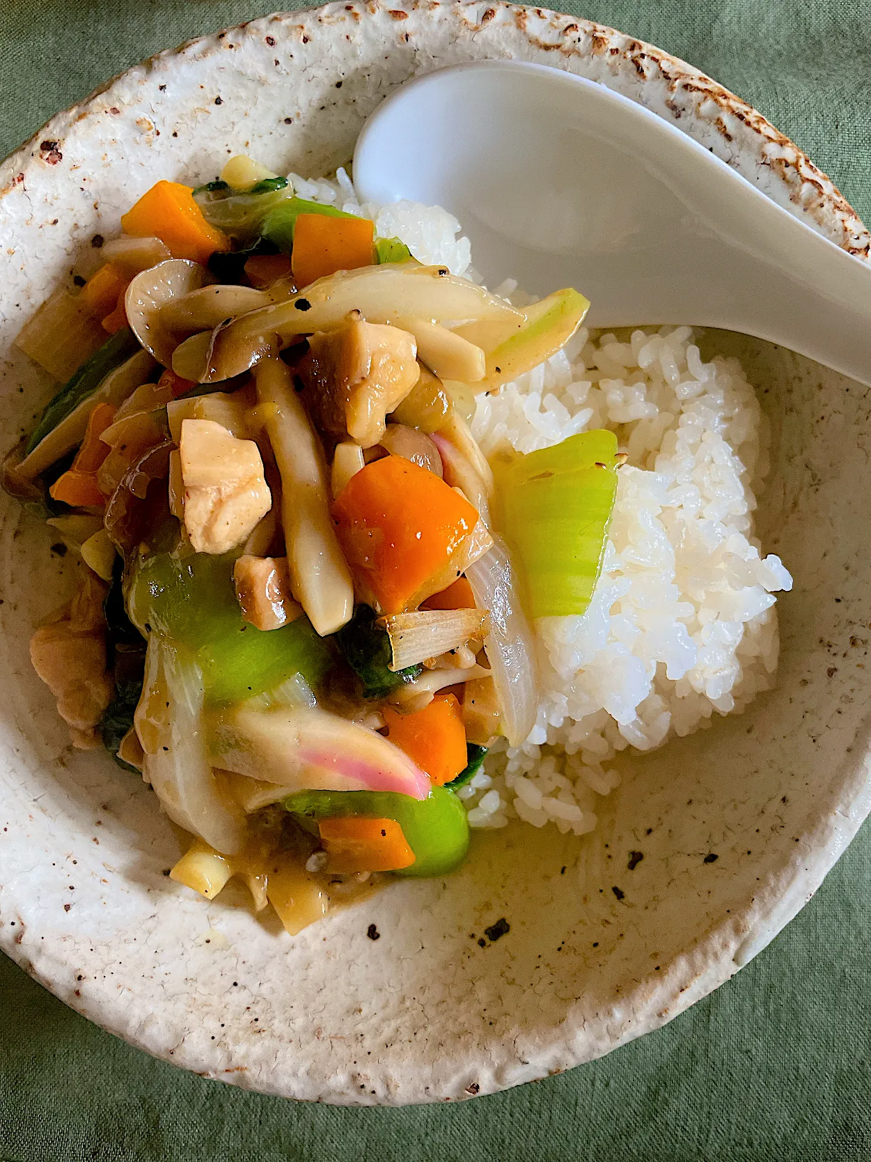 #鶏肉 #人参 #玉ねぎ #しめじ #セロリ #長ネギ #ごはん #丼
