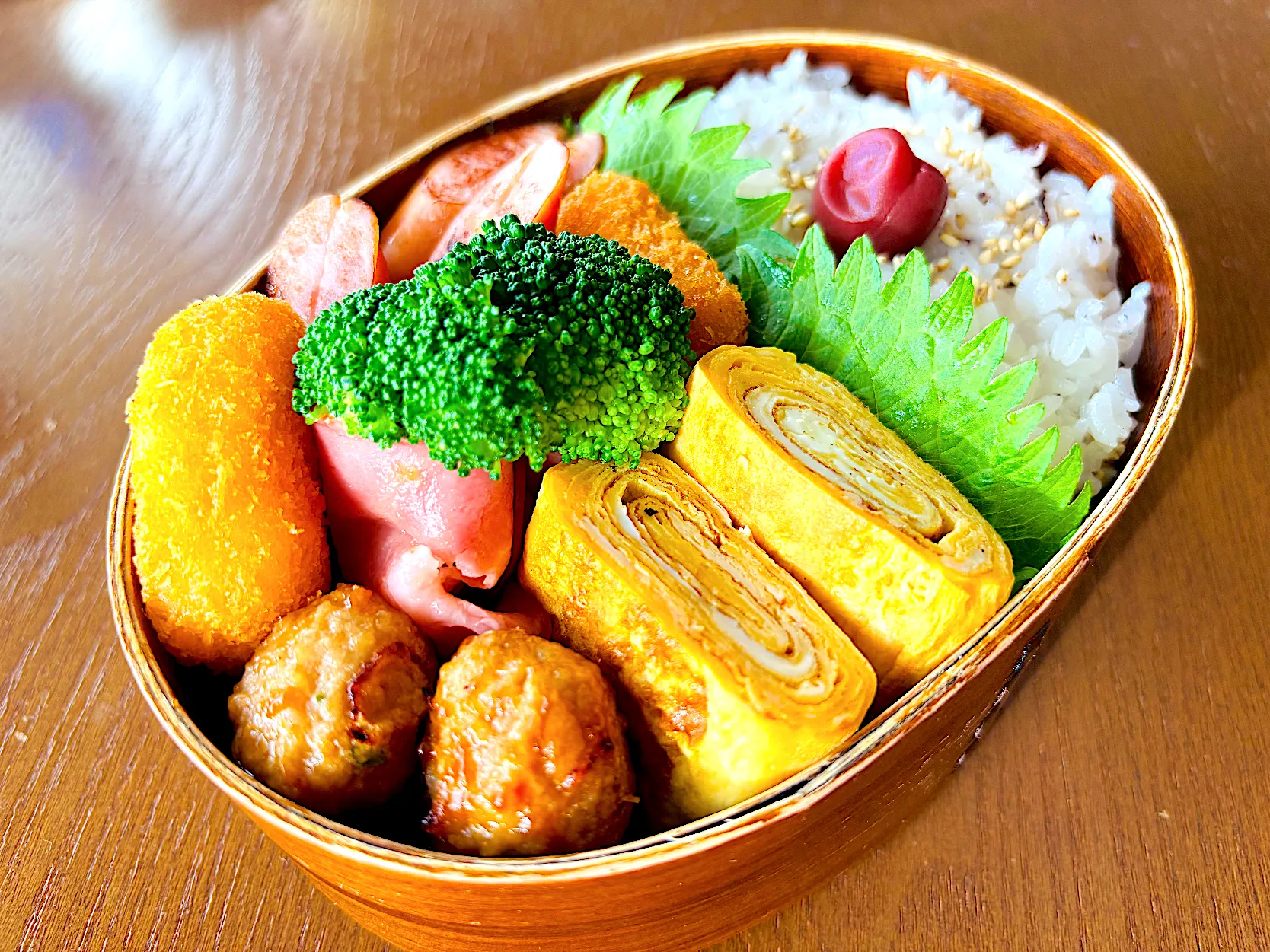 #出汁巻玉子 #ベーコン巻きブロッコリー #しそごま混ぜご飯 #お弁当 #曲げわっぱ弁当箱 #わっぱ弁当 #曲げわっぱ #自家製梅干し #雪若丸